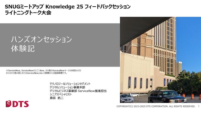 登壇者の紹介① 会社の属性 ・従業員サポートデスクサービス ・CSM Pro ・ C & I ・ Re s e l l e r ・ 約 1 6 0 名 の 体 制 2020年 3月~ ServiceNow 推進担当 ServiceNow ユーザー ServiceNow パートナー ServiceNow 専門組織 株式会社DTS テクノロジー&ソリューションセグメント デジタルソリューション事業本部 デジタルビジネス事業部 ServiceNow推進担当 SNUGミートアップ K25 LT