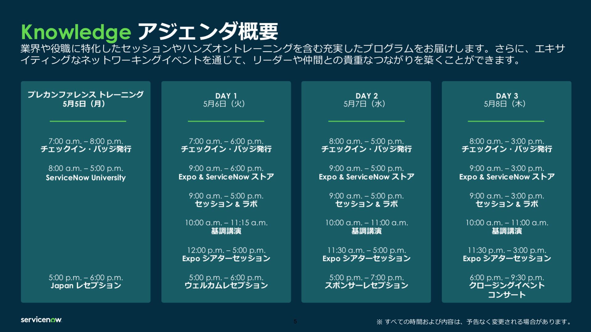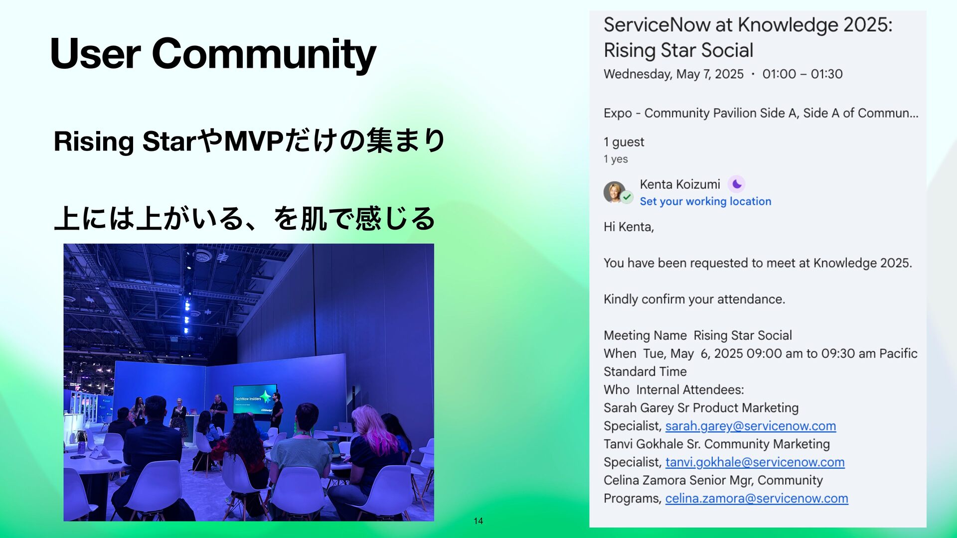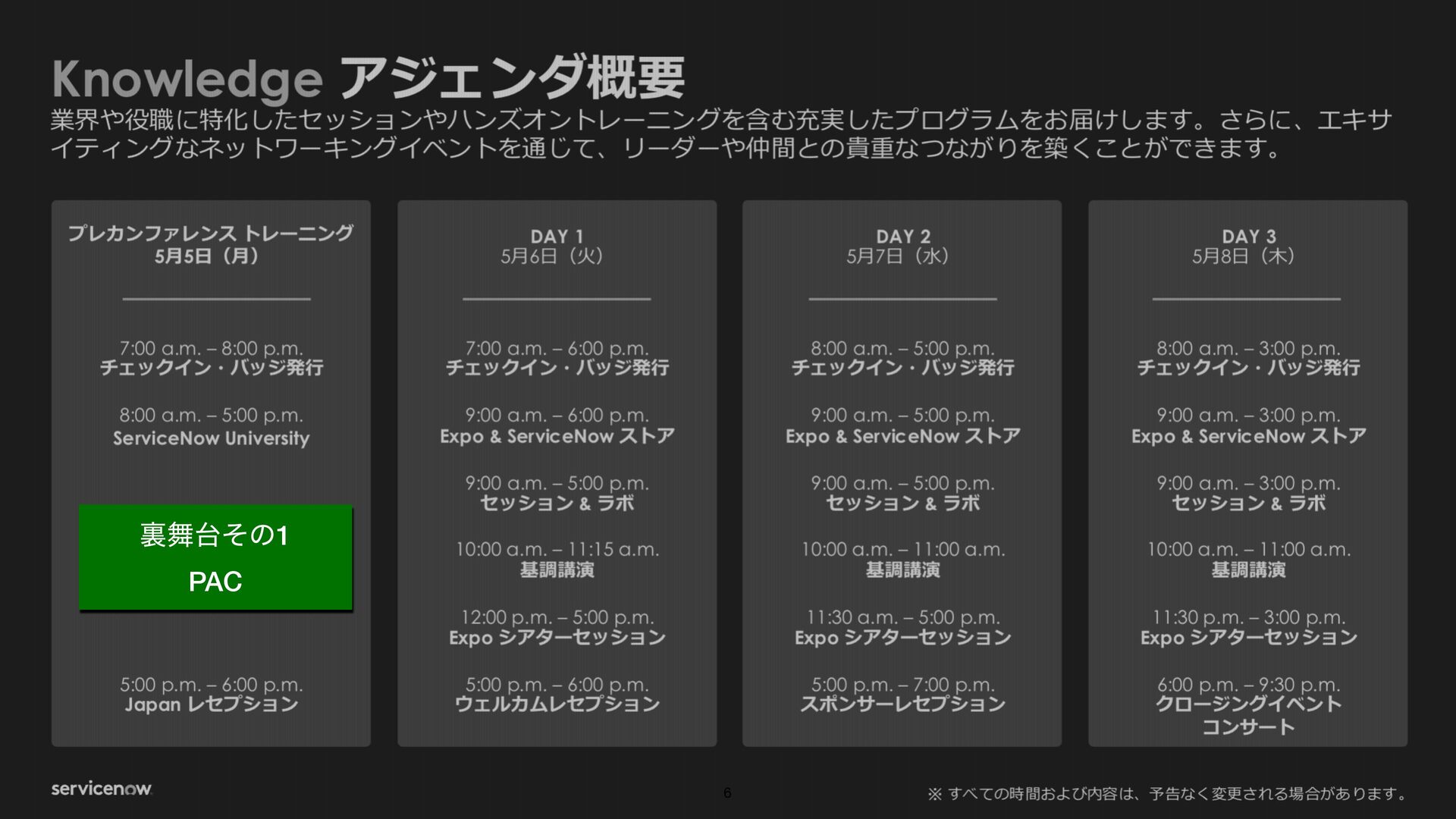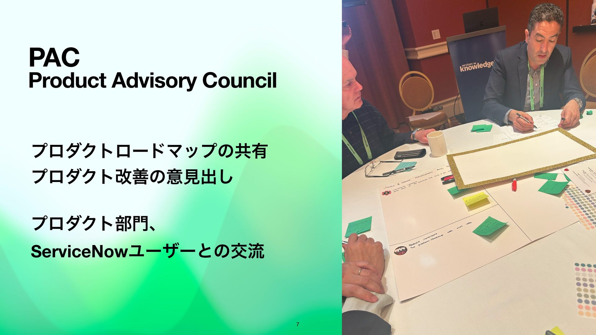 Knowledge では、Product Advisory Councilや、本社の製品のProduct ManagerとMeeting Centerを活用した対面での打ち合わせといったお客様のユースケースにあったプロダクト活用方法のセッションを独自にアポを設定したり高度な活用を可能です。事前に関係者と調整して参加することで、濃密なKnowledgeを体験できます。