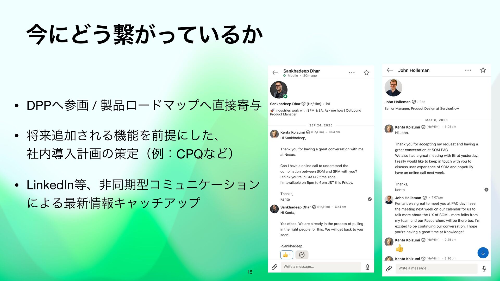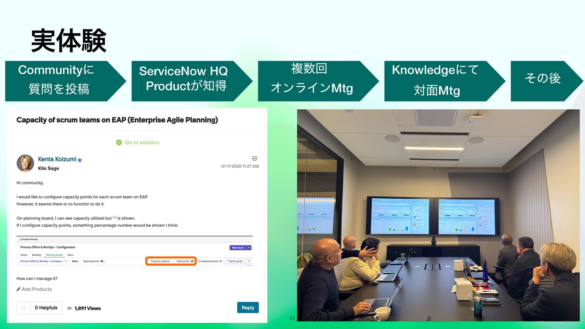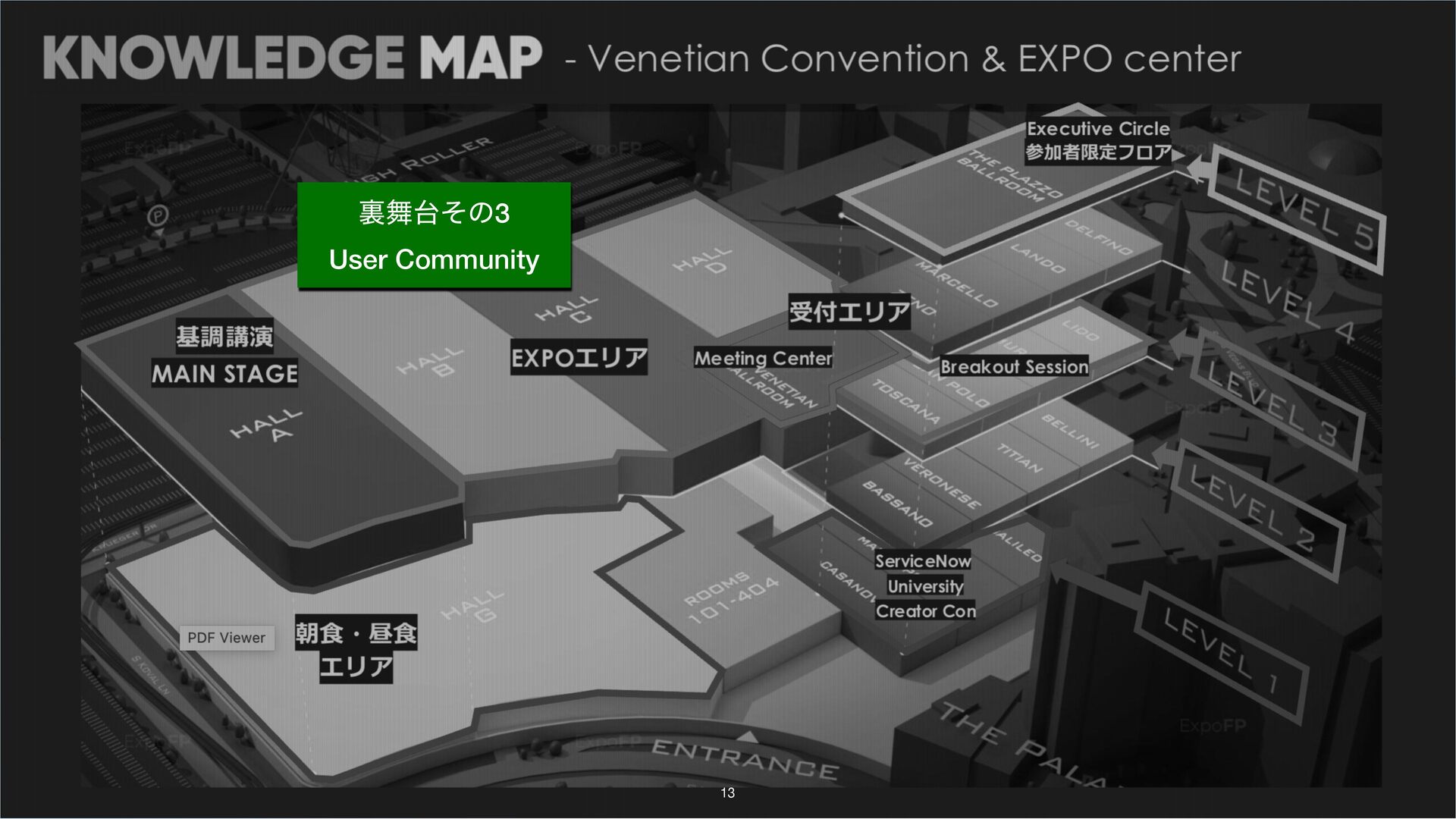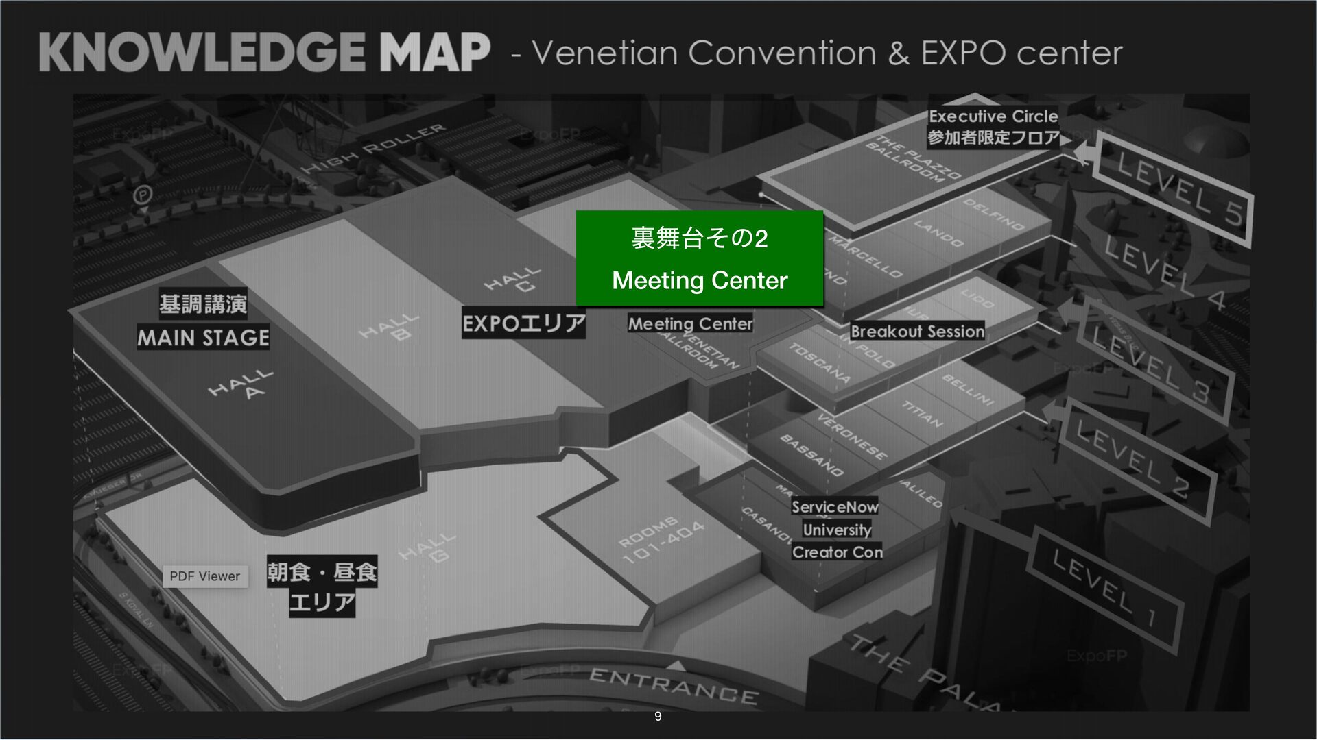 Knowledge では、Product Advisory Councilや、本社の製品のProduct ManagerとMeeting Centerを活用した対面での打ち合わせといったお客様のユースケースにあったプロダクト活用方法のセッションを独自にアポを設定したり高度な活用を可能です。事前に関係者と調整して参加することで、濃密なKnowledgeを体験できます。