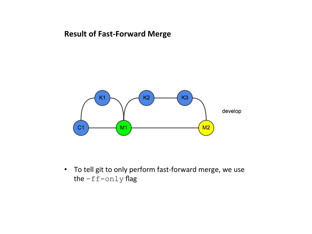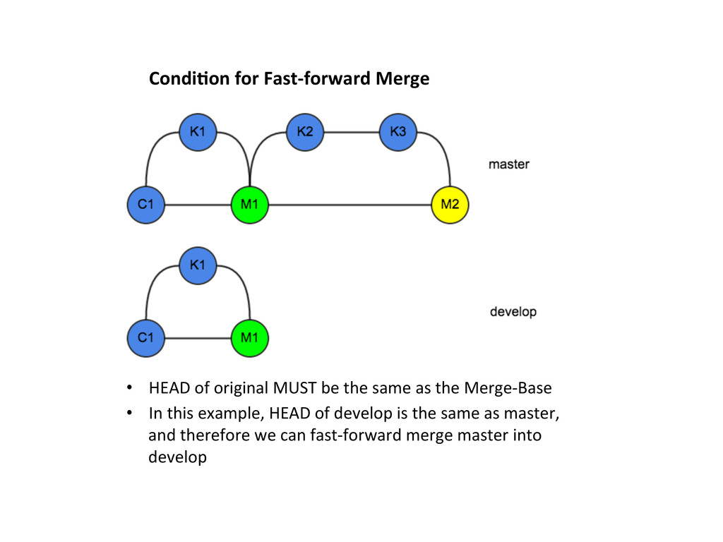 is NOT the same as the Merge-‐Base • It is NOT possible to fast-‐forward merge master into develop • git –ff-only master while on develop, will yield fatal: Not possible to fast-forward, aborting.