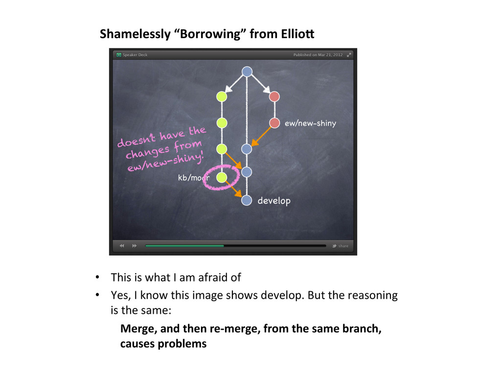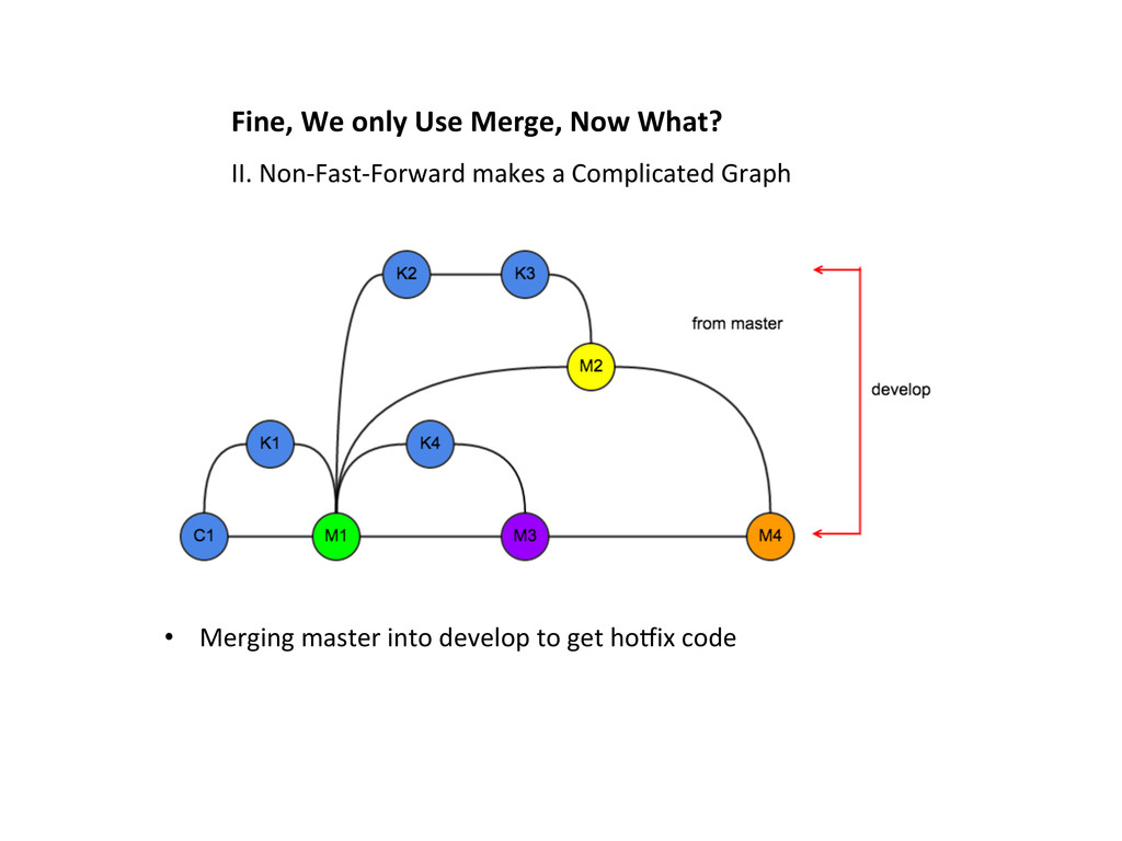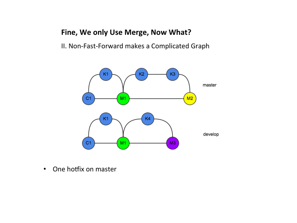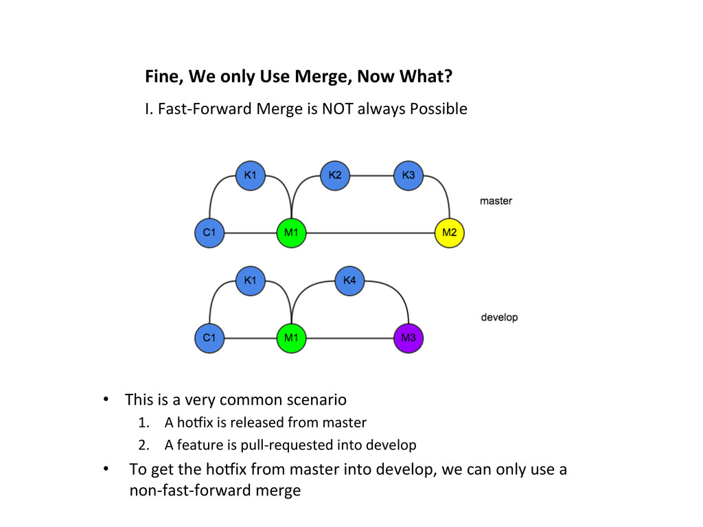is a very common scenario 1. A hoOix is released from master 2. A feature is pull-‐requested into develop • To get the hoOix from master into develop, we can only use a non-‐fast-‐forward merge I. Fast-‐Forward Merge is NOT always Possible