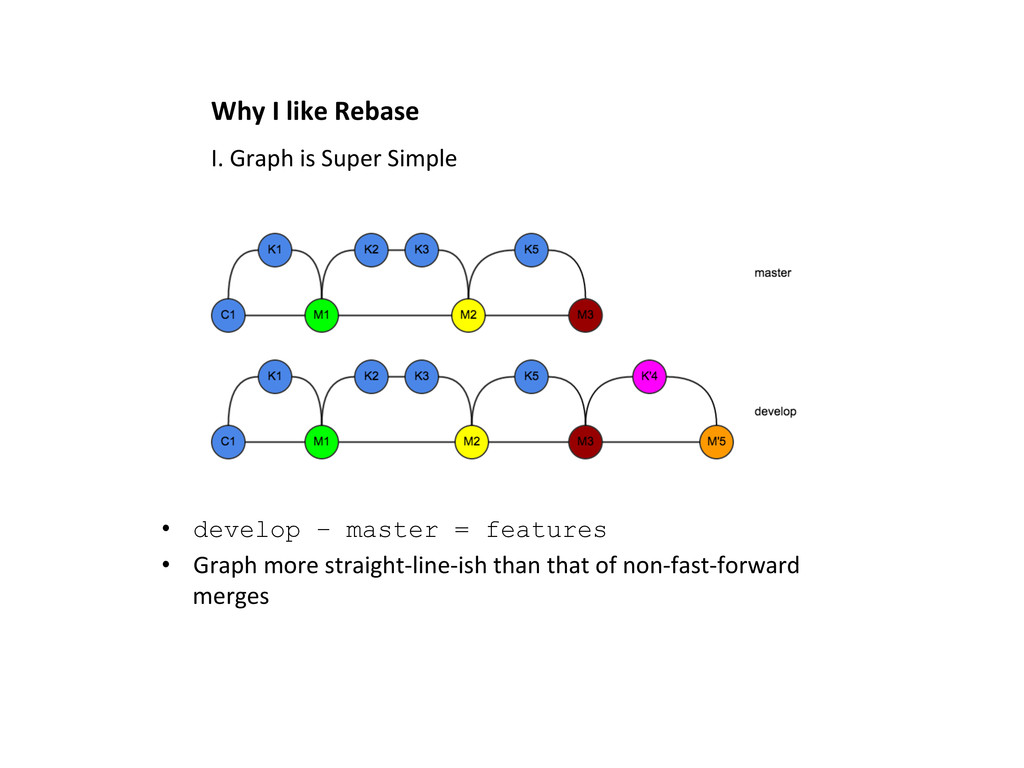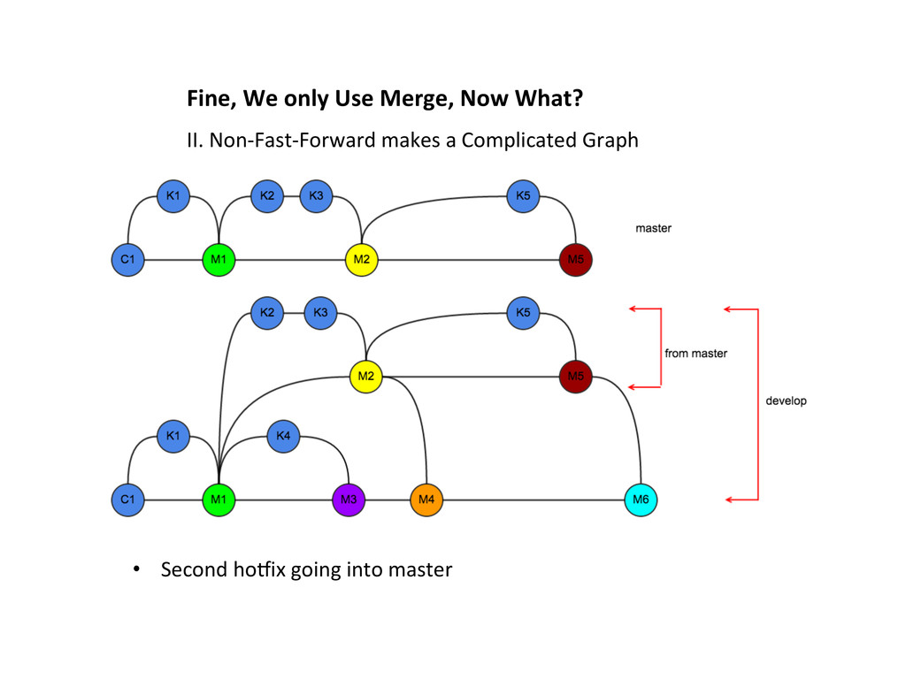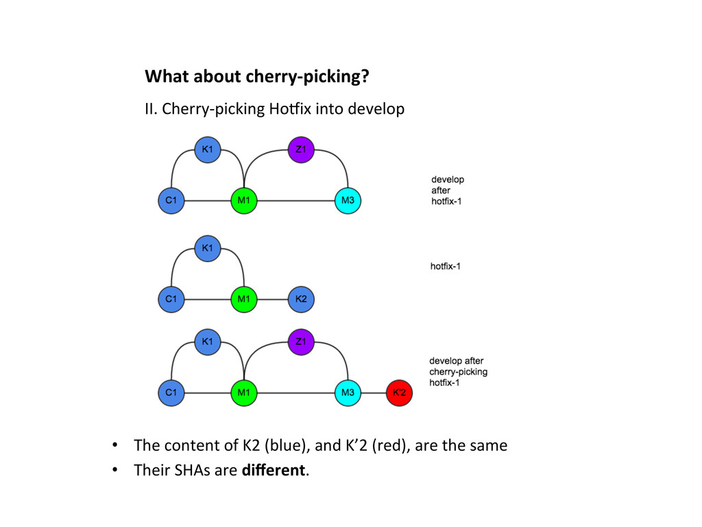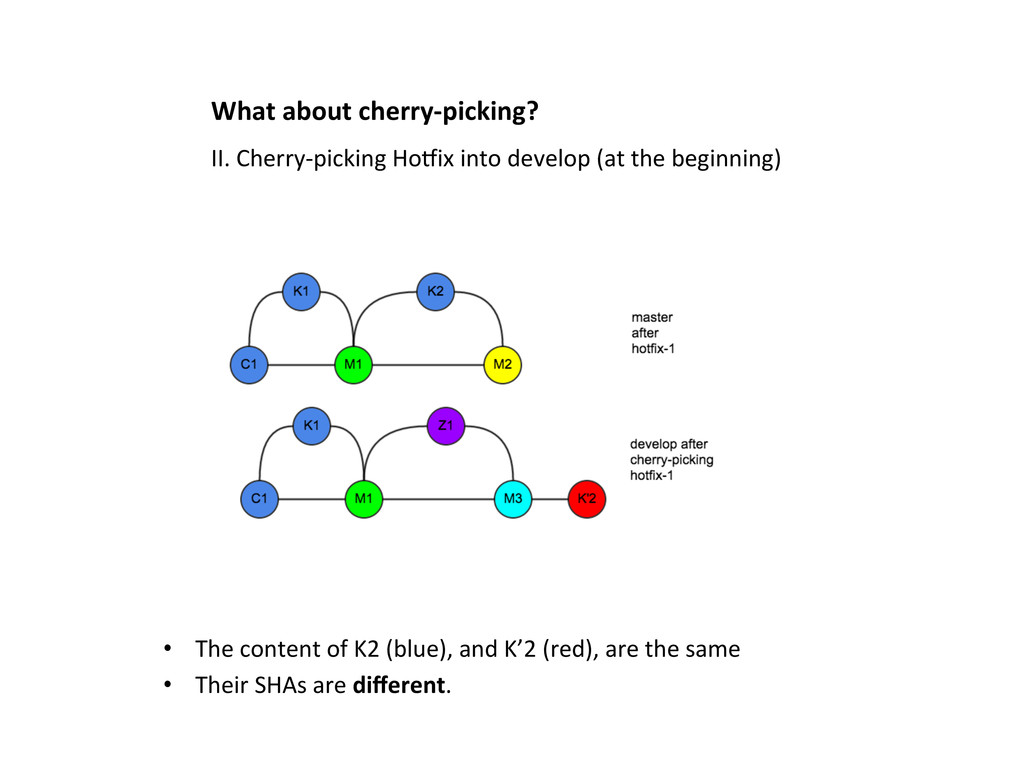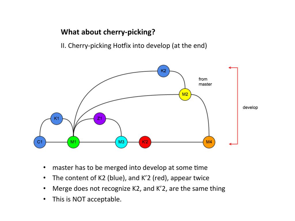 into develop at some Lme • The content of K2 (blue), and K’2 (red), appear twice • Merge does not recognize K2, and K’2, are the same thing • This is NOT acceptable. II. Cherry-‐picking HoOix into develop (at the end)
