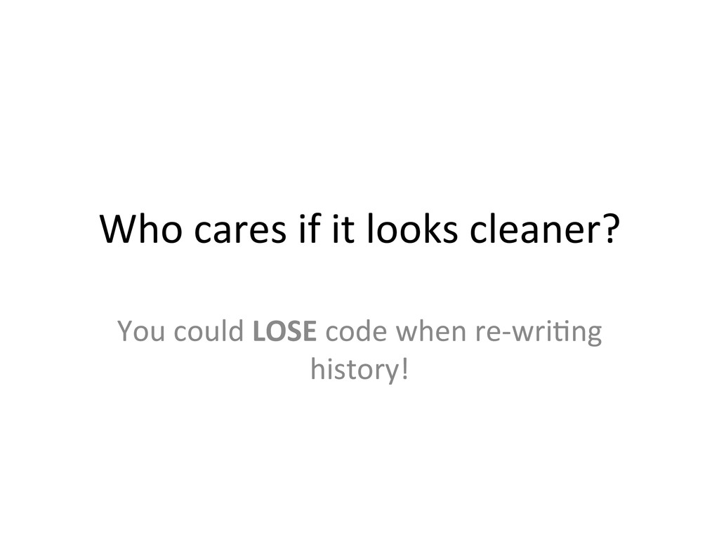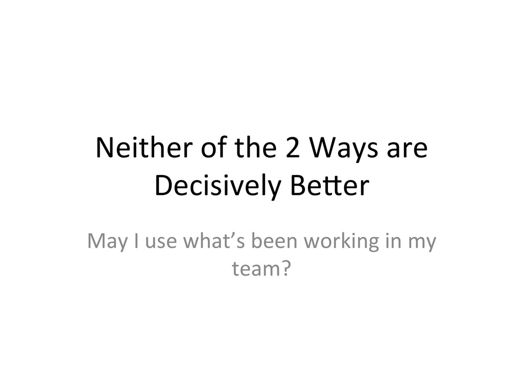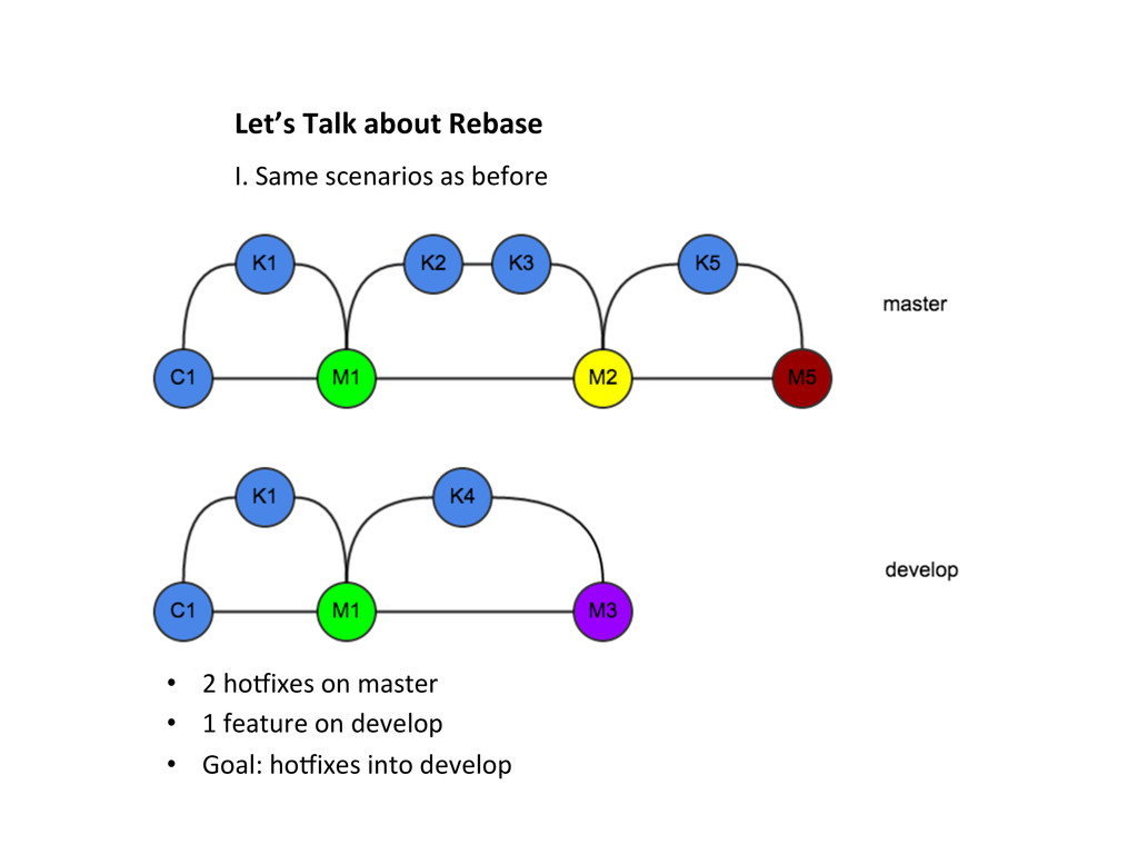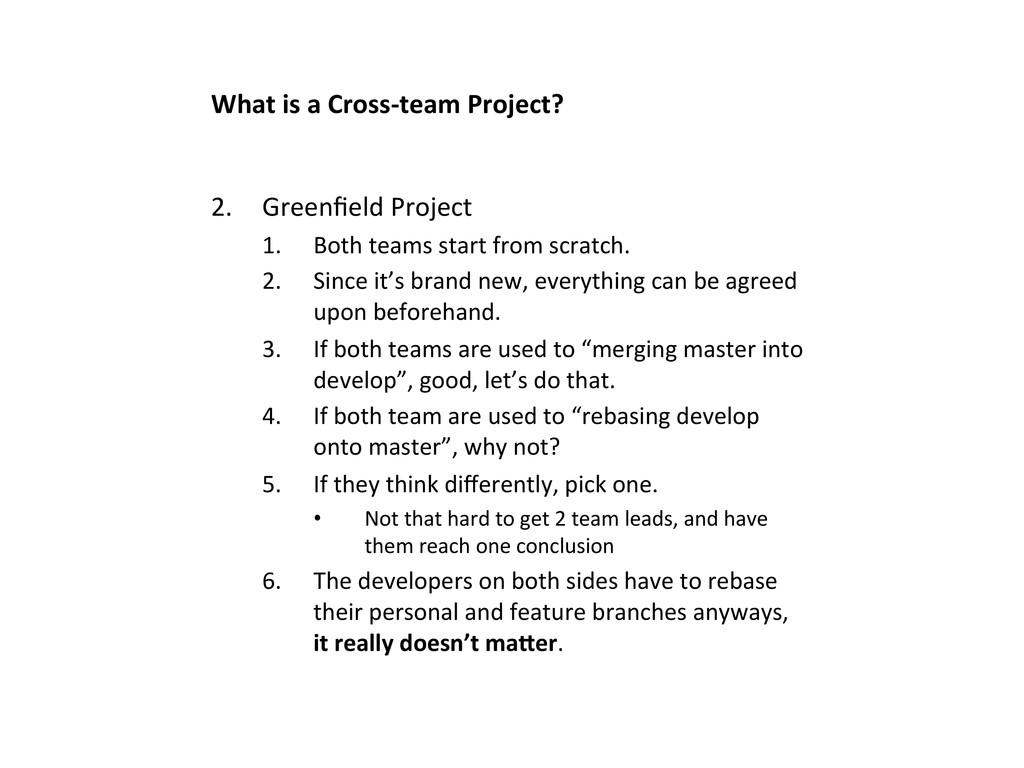 1. Both teams start from scratch. 2. Since it’s brand new, everything can be agreed upon beforehand. 3. If both teams are used to “merging master into develop”, good, let’s do that. 4. If both team are used to “rebasing develop onto master”, why not? 5. If they think differently, pick one. • Not that hard to get 2 team leads, and have them reach one conclusion 6. The developers on both sides have to rebase their personal and feature branches anyways, it really doesn’t maUer.