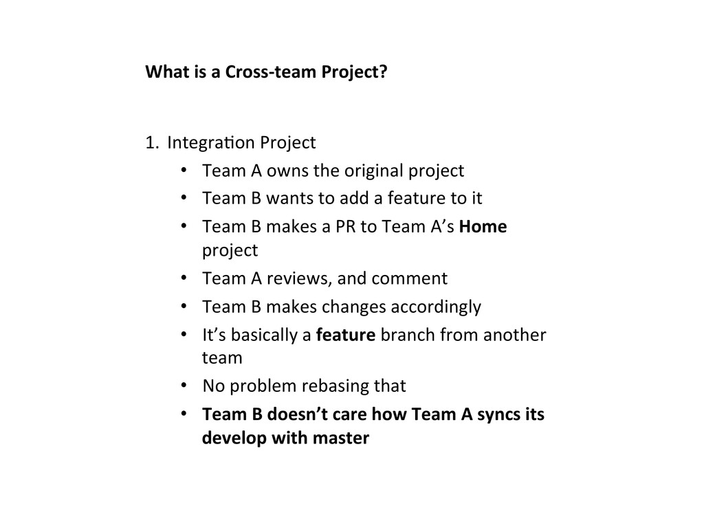 • Team A owns the original project • Team B wants to add a feature to it • Team B makes a PR to Team A’s Home project • Team A reviews, and comment • Team B makes changes accordingly • It’s basically a feature branch from another team • No problem rebasing that • Team B doesn’t care how Team A syncs its develop with master