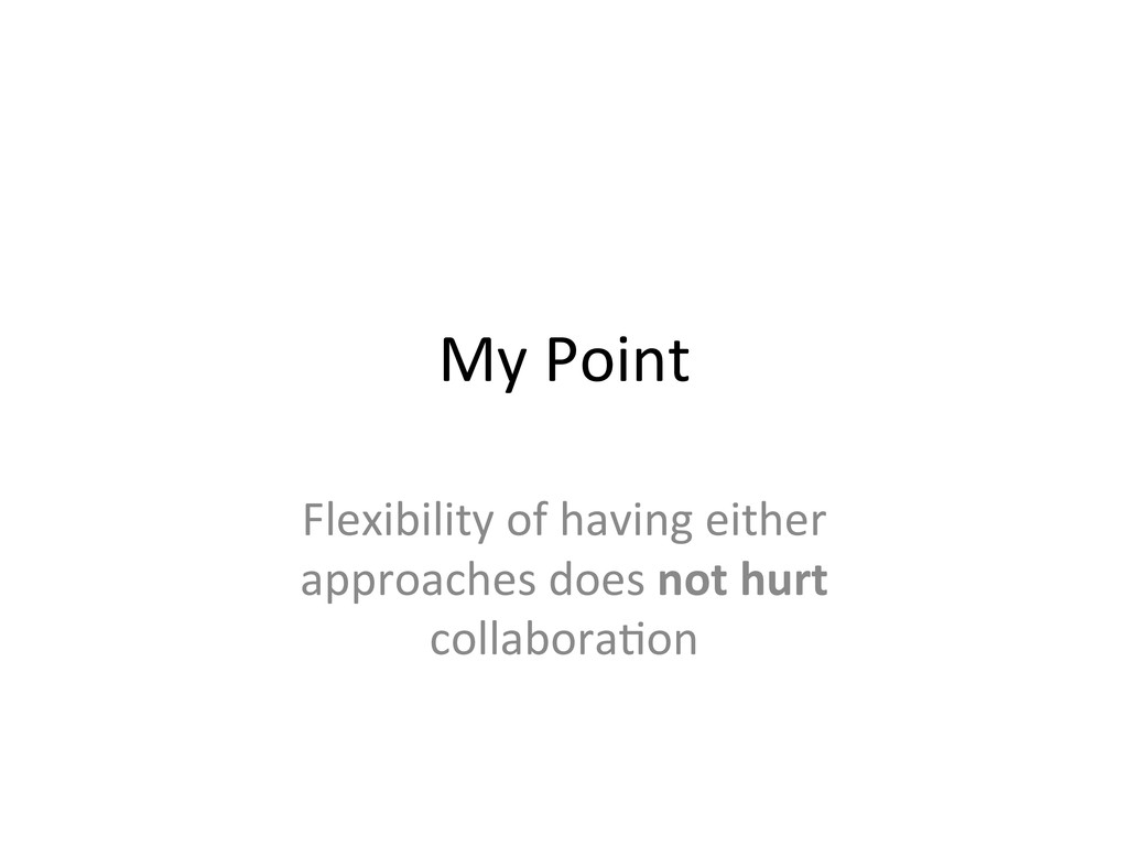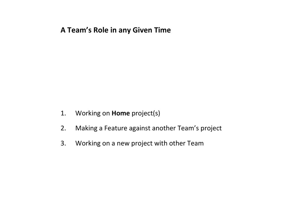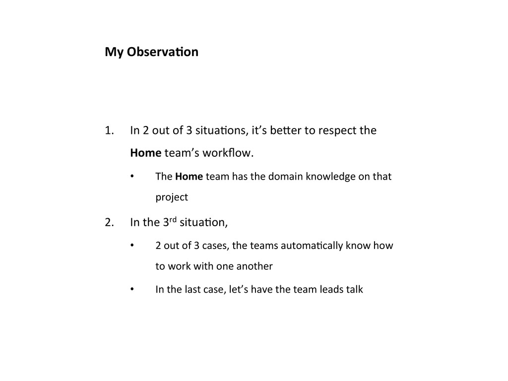 it’s beler to respect the Home team’s workflow. • The Home team has the domain knowledge on that project 2. In the 3rd situaLon, • 2 out of 3 cases, the teams automaLcally know how to work with one another • In the last case, let’s have the team leads talk