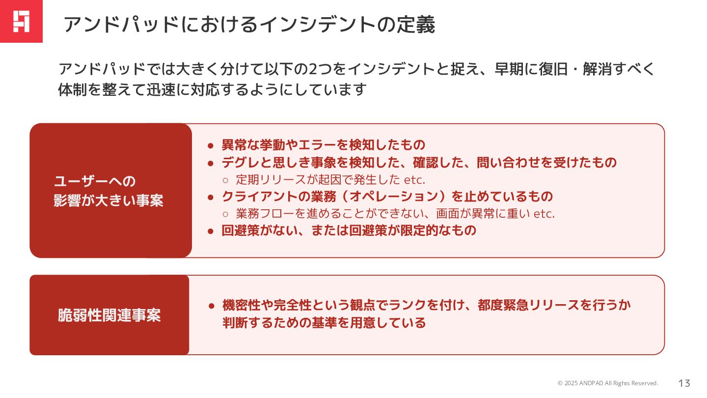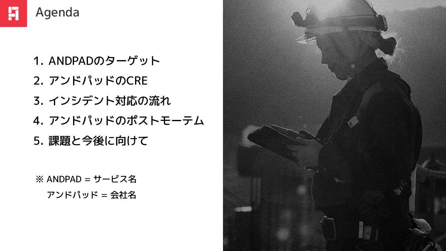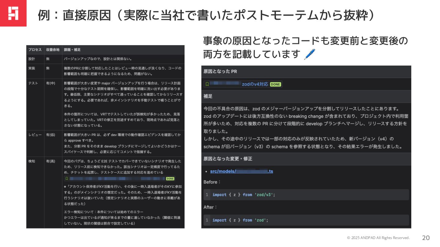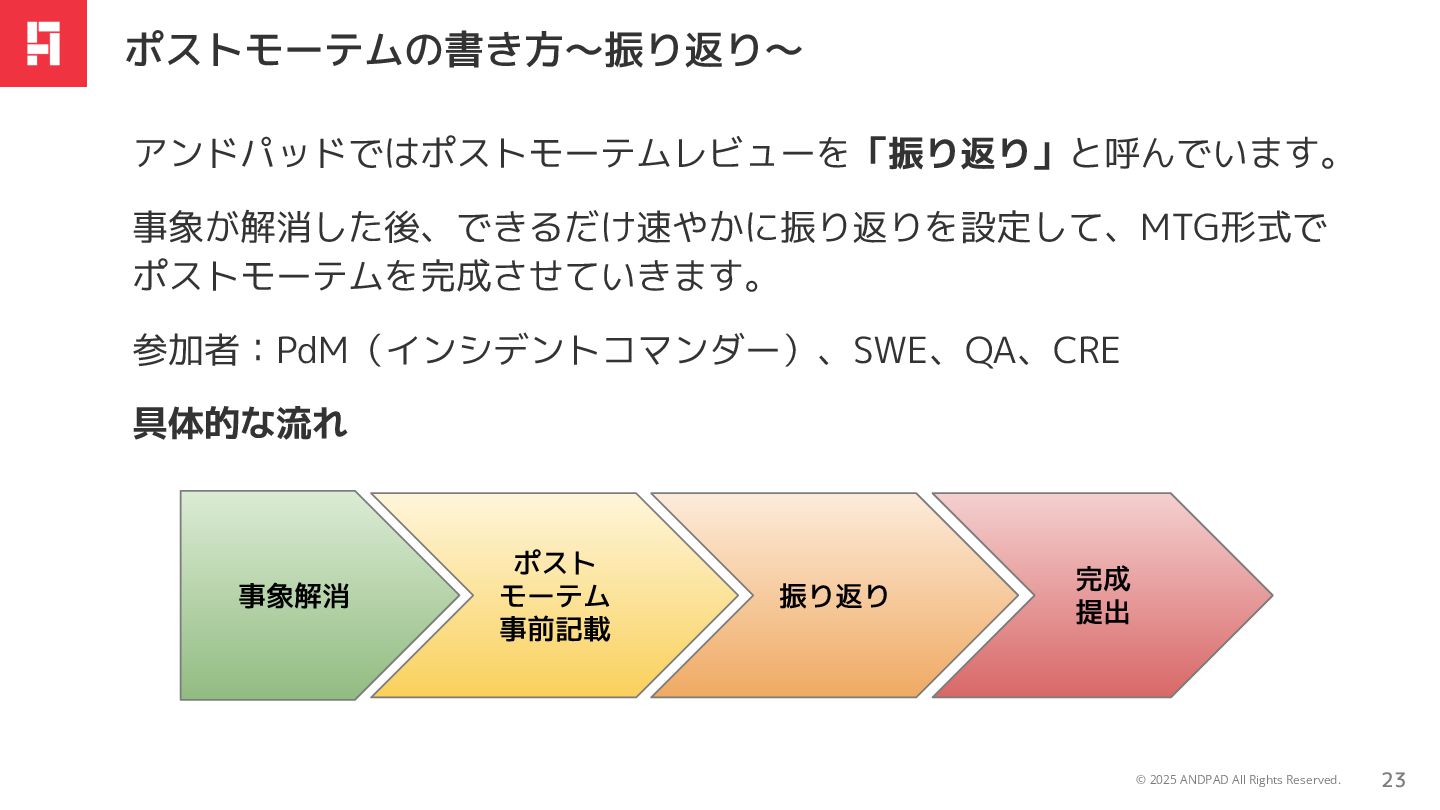 参照元: Postmortem Culture: Learning from Failure 1. A postmortem is a written record of an incident, its impact, the actions taken to mitigate or resolve it, the root cause(s), and the follow-up actions to prevent the incident from recurring. 2. インシデント、その影響、インシデントを軽減または解決するために 取られた措置、根本原因、およびインシデントの再発を防止するため のフォローアップ措置の文書です アンドパッドにおける ポストモーテムとは? 1. インシデントの概要から再発防止策までCRE含めた関係者で議論し、 開発組織のナレッジとしてまとめたドキュメントの総称及びその文化 2. ポストモーテムの目的は組織内における「学び」と考えているため、 いわゆる障害報告書や顛末書とは異なります