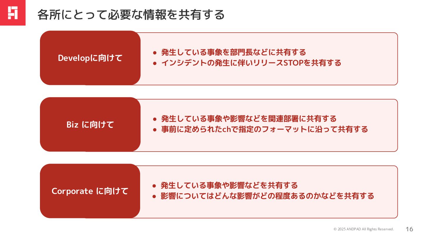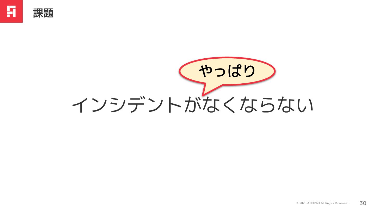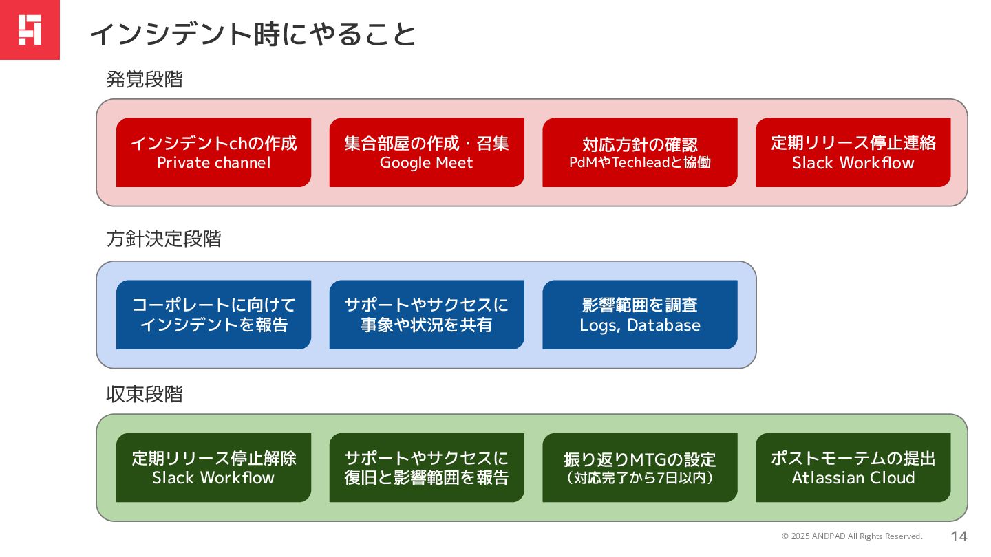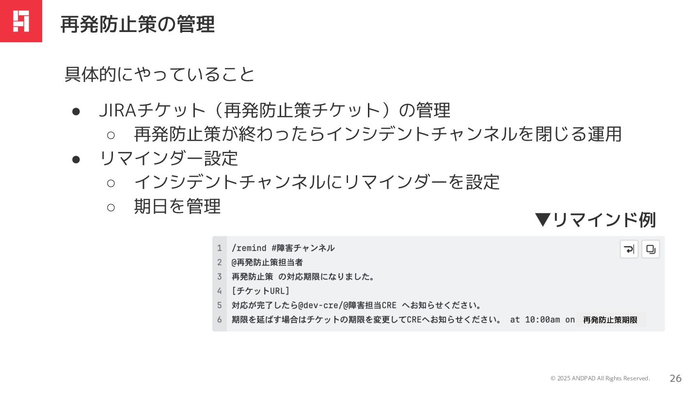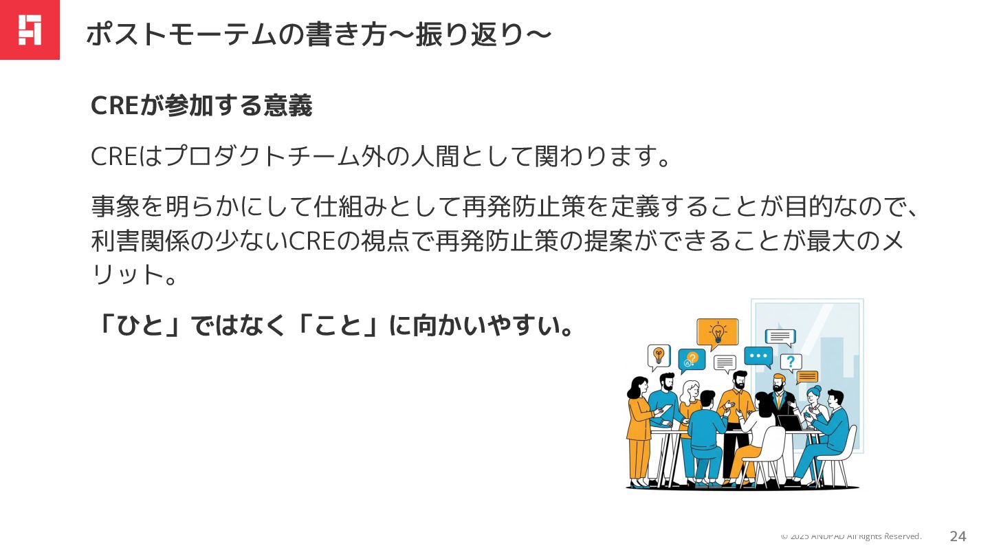 参照元: Postmortem Culture: Learning from Failure 1. A postmortem is a written record of an incident, its impact, the actions taken to mitigate or resolve it, the root cause(s), and the follow-up actions to prevent the incident from recurring. 2. インシデント、その影響、インシデントを軽減または解決するために 取られた措置、根本原因、およびインシデントの再発を防止するため のフォローアップ措置の文書です アンドパッドにおける ポストモーテムとは? 1. インシデントの概要から再発防止策までCRE含めた関係者で議論し、 開発組織のナレッジとしてまとめたドキュメントの総称及びその文化 2. ポストモーテムの目的は組織内における「学び」と考えているため、 いわゆる障害報告書や顛末書とは異なります