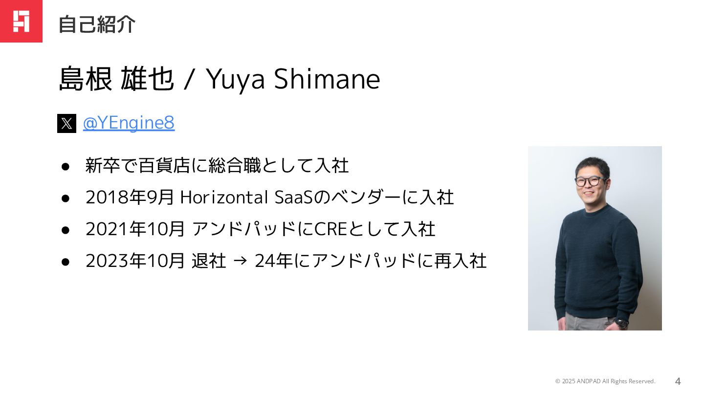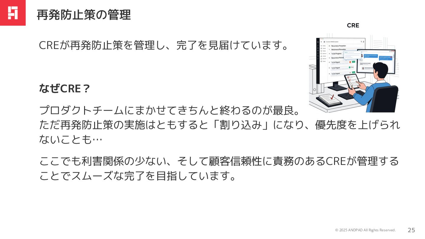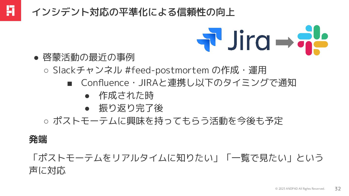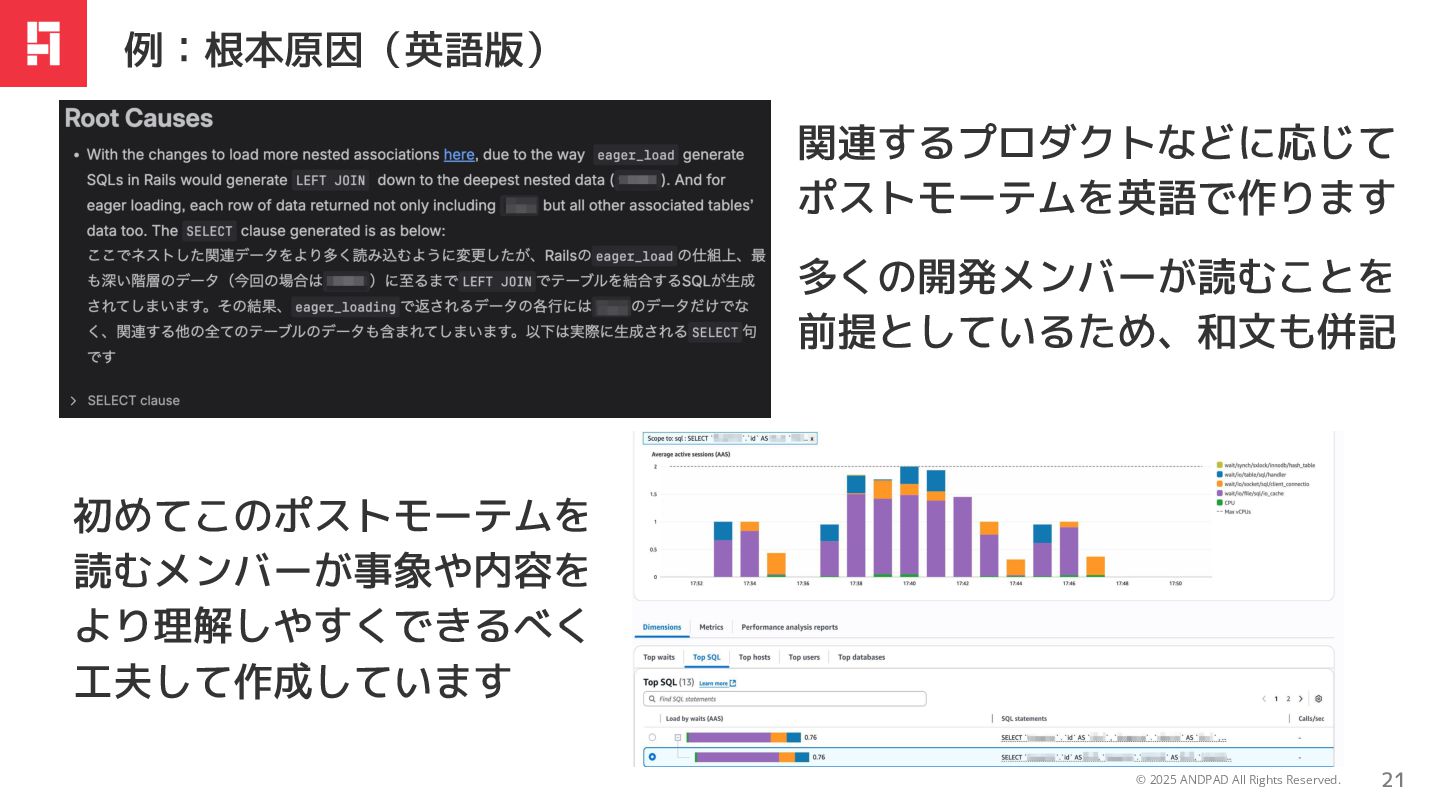 参照元: Postmortem Culture: Learning from Failure 1. A postmortem is a written record of an incident, its impact, the actions taken to mitigate or resolve it, the root cause(s), and the follow-up actions to prevent the incident from recurring. 2. インシデント、その影響、インシデントを軽減または解決するために 取られた措置、根本原因、およびインシデントの再発を防止するため のフォローアップ措置の文書です アンドパッドにおける ポストモーテムとは? 1. インシデントの概要から再発防止策までCRE含めた関係者で議論し、 開発組織のナレッジとしてまとめたドキュメントの総称及びその文化 2. ポストモーテムの目的は組織内における「学び」と考えているため、 いわゆる障害報告書や顛末書とは異なります