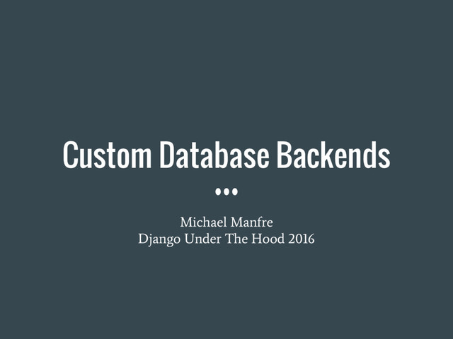 coverage • Test Driven Development for custom database backends ◦ Feature and bug fix PRs require tests that database backends get to use ◦ Avoids “working as implemented” tests • Test failures can be expected ◦ PR to fix for the future Django. Local branch for now ◦ Monkey patch tests with @expectedFailure ◦ Different expected value for assertNumQueries • Still need backend specific test suite!