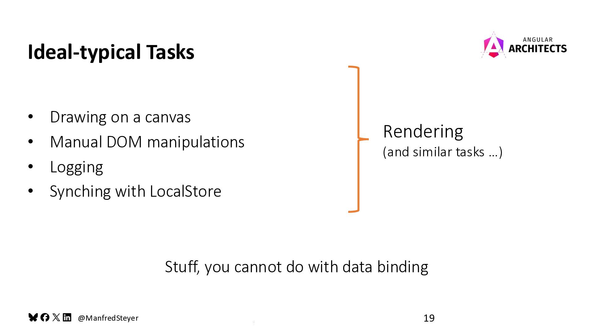 DOM manipulations • Logging • Synching with LocalStore Ideal-typical Tasks Rendering (and similar tasks …) Stuff, you cannot do with data binding