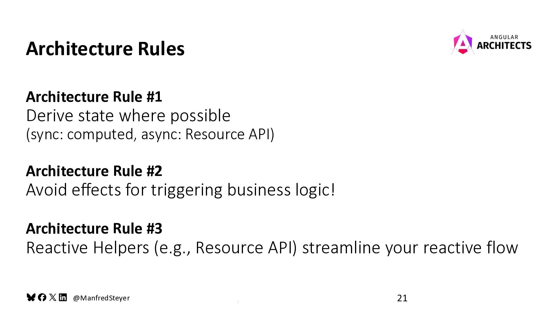 (sync: computed, async: Resource API) Architecture Rule #2 Avoid effects for triggering business logic! Architecture Rule #3 Reactive Helpers (e.g., Resource API) streamline your reactive flow Architecture Rules