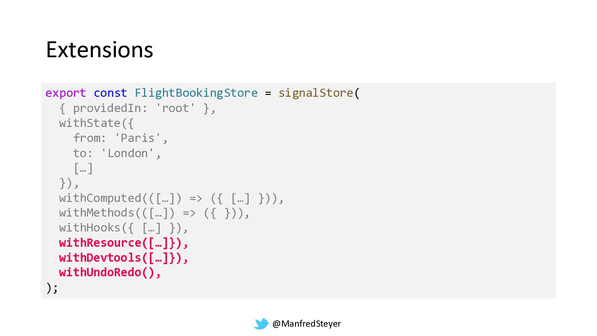@ManfredSteyer Extensions export const FlightBookingStore = signalStore( { providedIn: 'root'