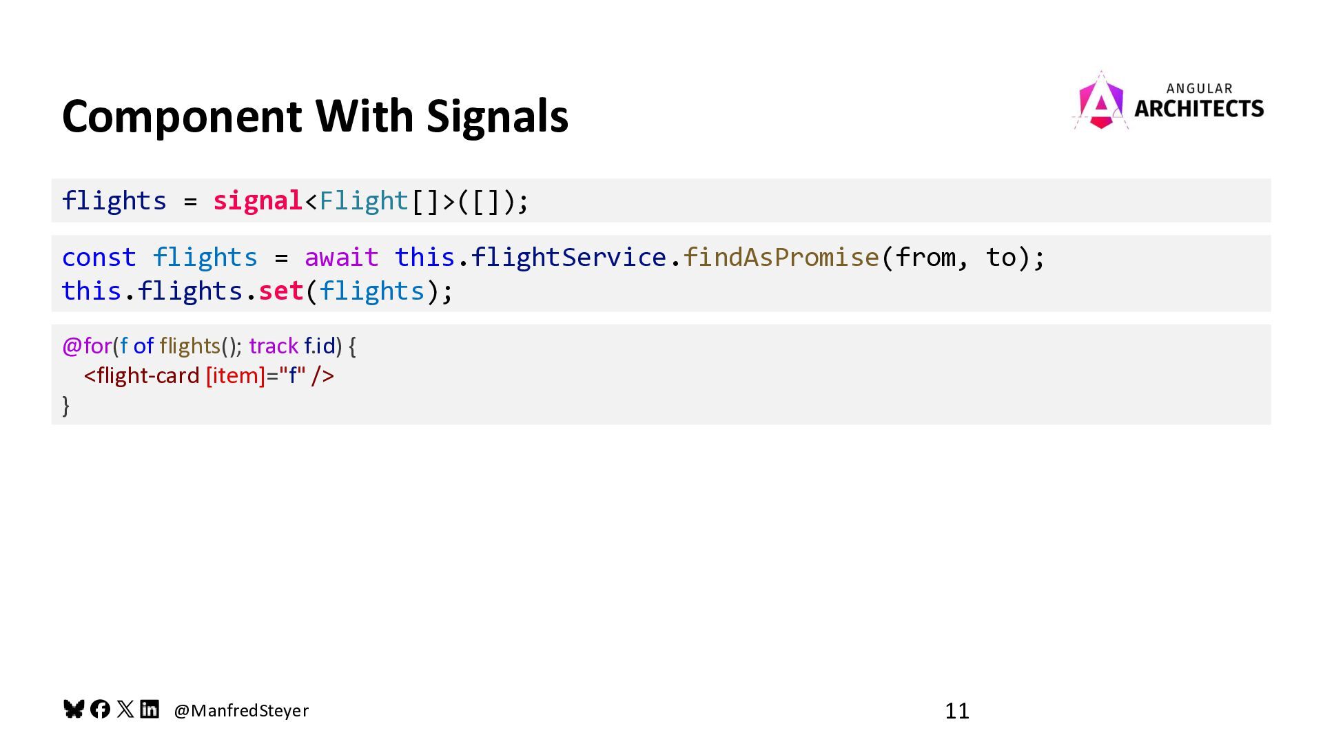 @ManfredSteyer @ManfredSteyer 11 Component With Signals flights = signal<Flight[]>([]); const