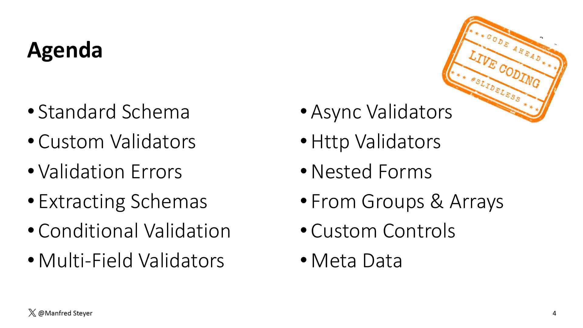 Schema • Custom Validators • Validation Errors • Extracting Schemas • Conditional Validation • Multi-Field Validators •Async Validators •Http Validators •Nested Forms •From Groups & Arrays •Custom Controls •Meta Data 4 Agenda