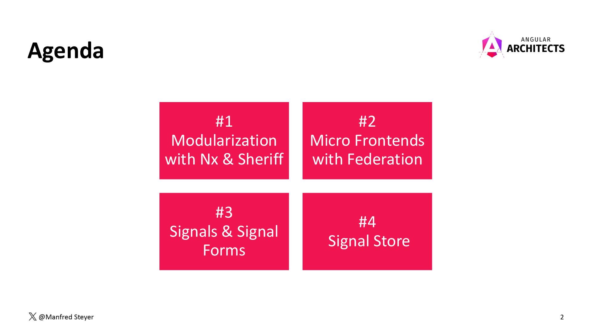 #1 Modularization with Nx & Sheriff #2 Micro Frontends with Federation #3 Signals & Signal Forms #4 Signal Store