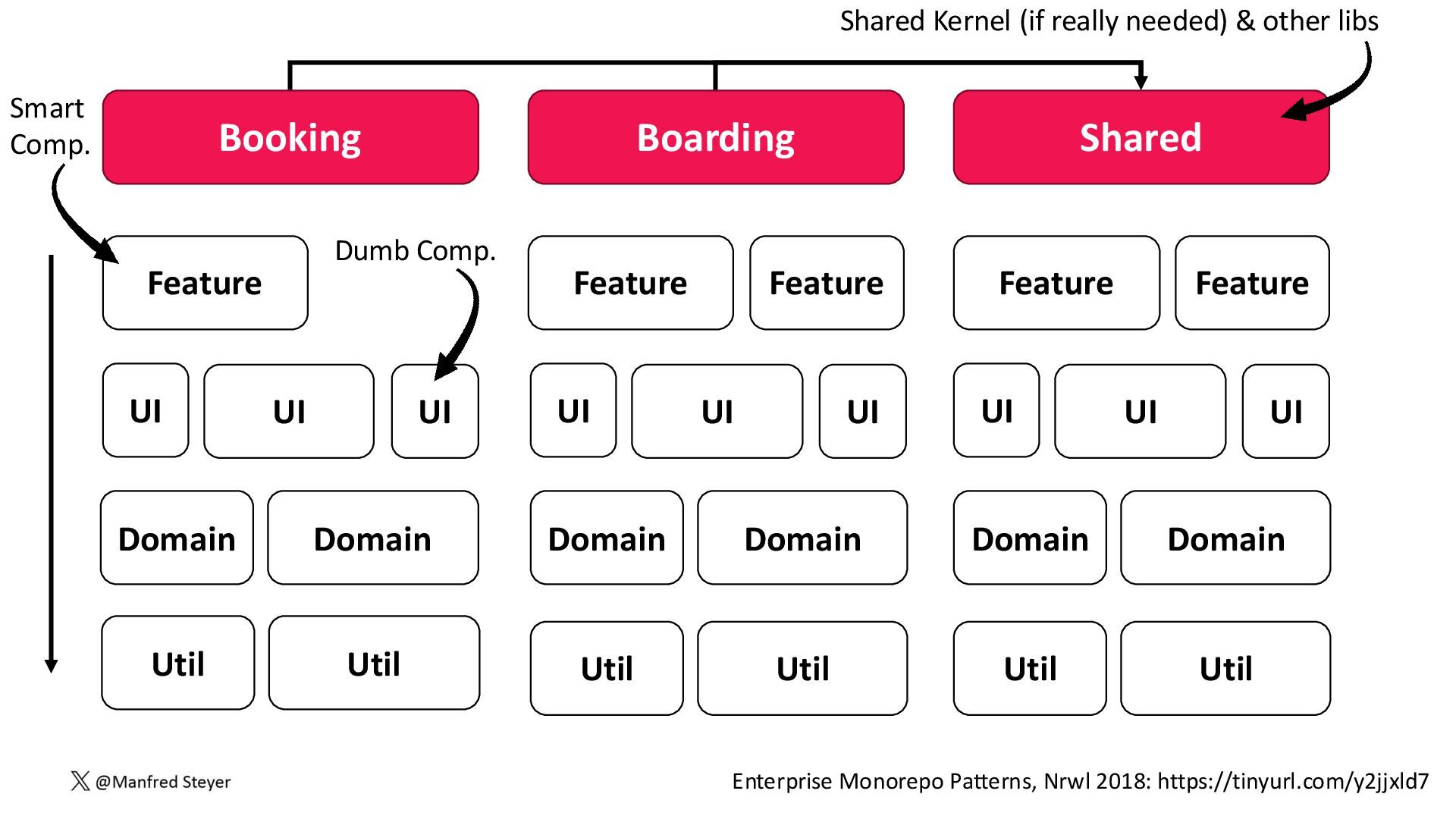 Boarding Shared Feature Feature Feature Feature Feature UI UI UI UI UI UI UI UI UI Domain Domain Domain Domain Domain Domain Util Util Util Util Util Util Enterprise Monorepo Patterns, Nrwl 2018: https://tinyurl.com/y2jjxld7 Smart Comp. Dumb Comp. Shared Kernel (if really needed) & other libs