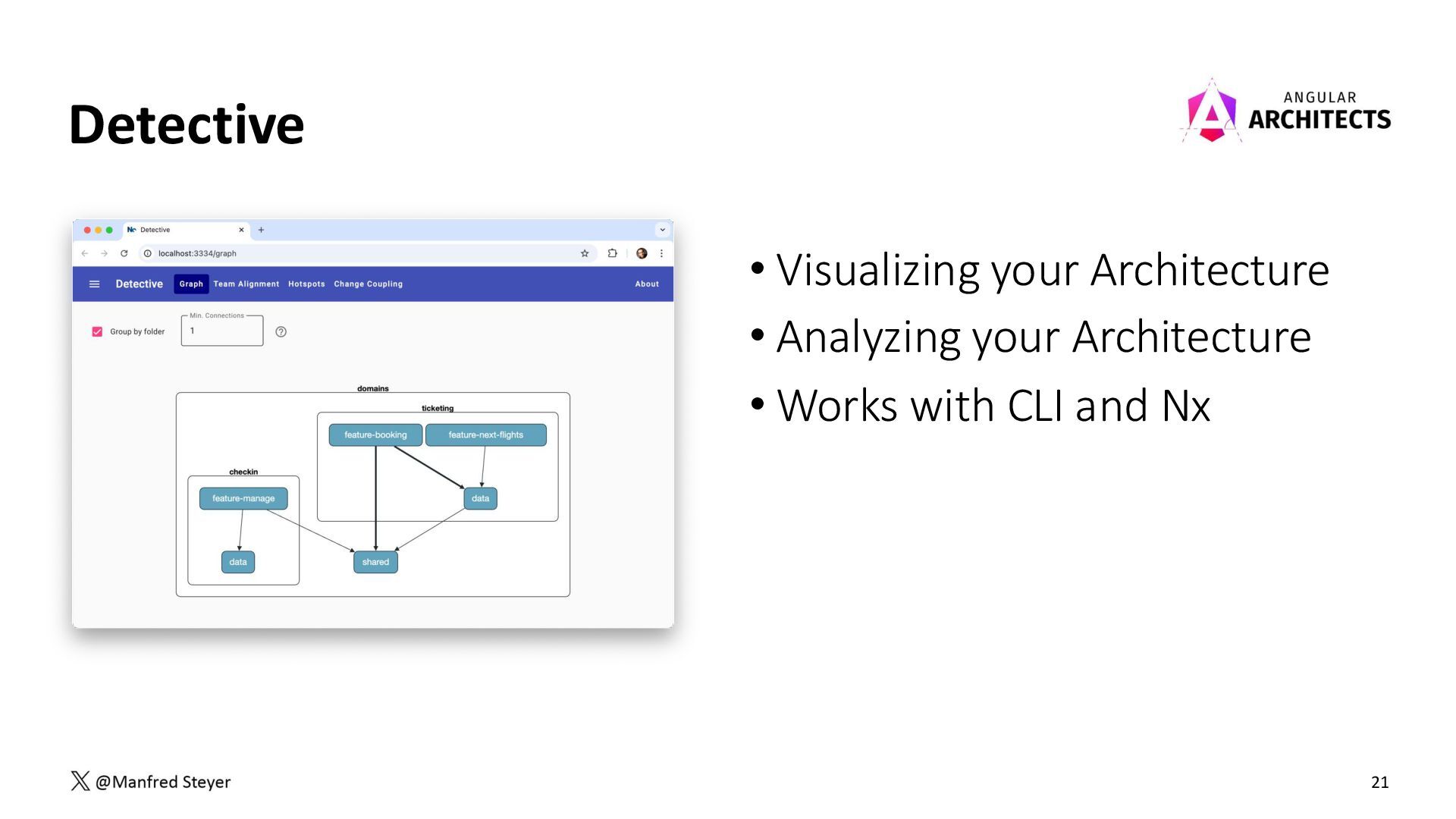your Architecture • Analyzing your Architecture • Works with CLI and Nx 21 Detective