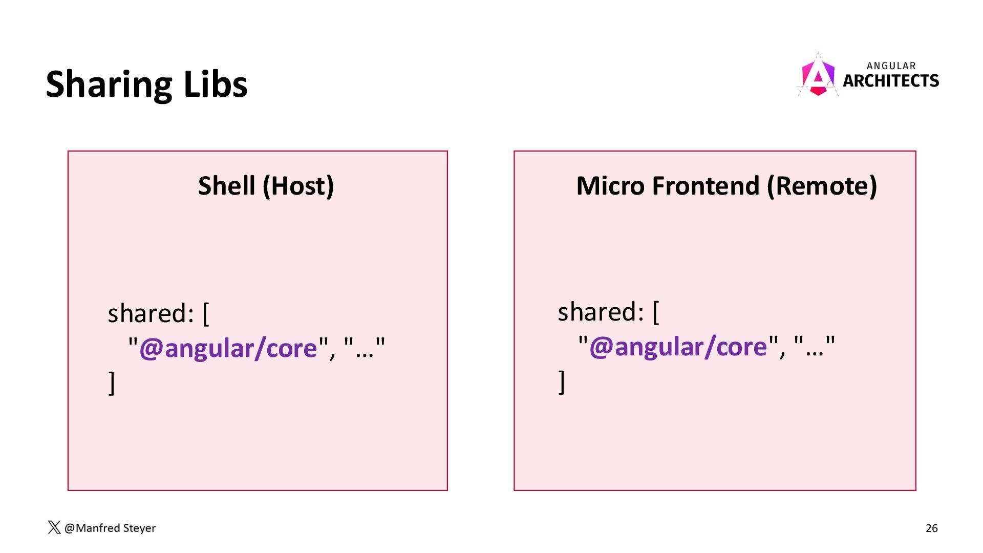 Libs Shell (Host) Micro Frontend (Remote) shared: [ "@angular/core", "…" ] shared: [ "@angular/core", "…" ]
