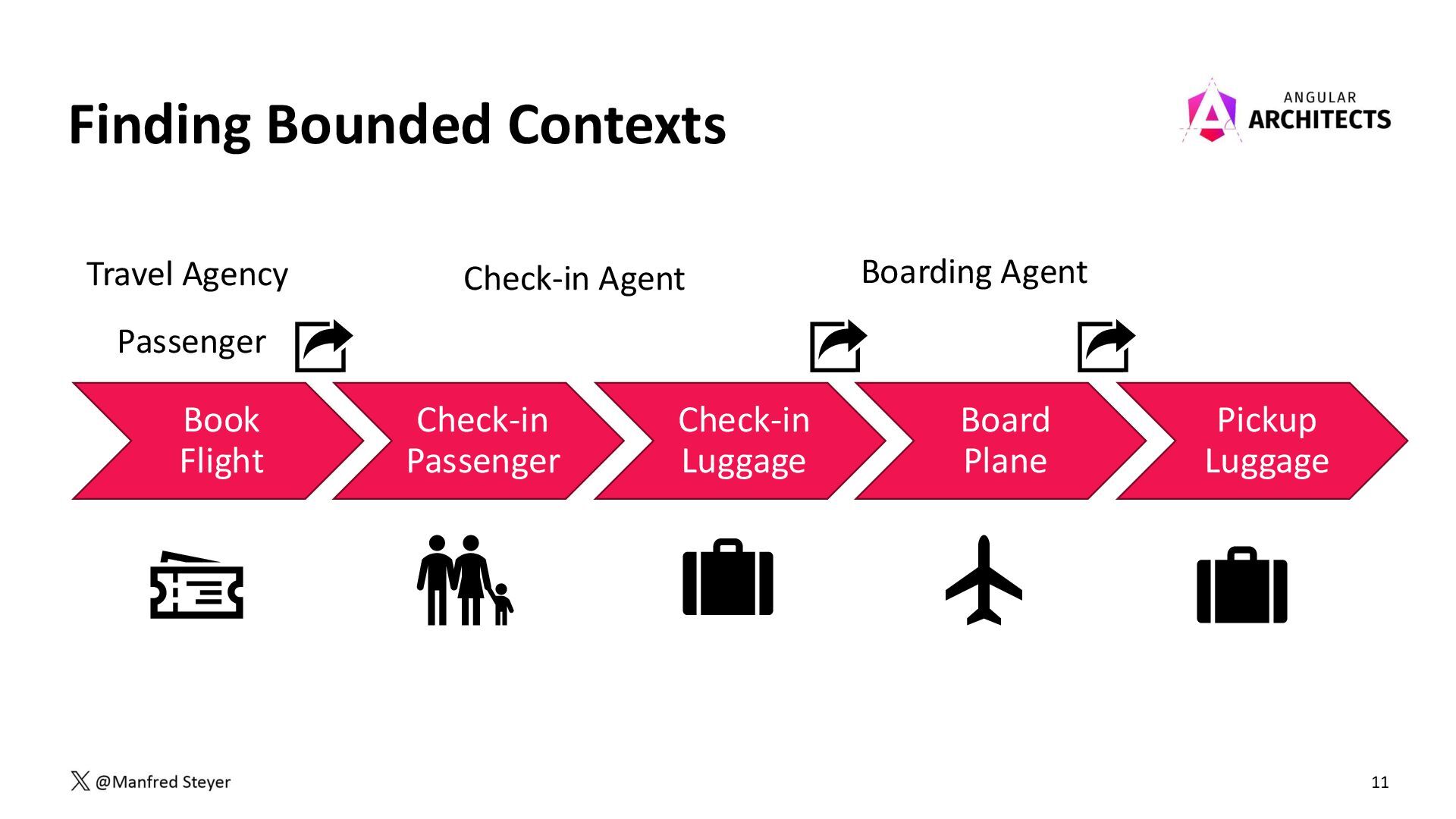 Bounded Contexts Passenger Travel Agency Check-in Agent Boarding Agent Book Flight Check-in Passenger Check-in Luggage Board Plane Pickup Luggage