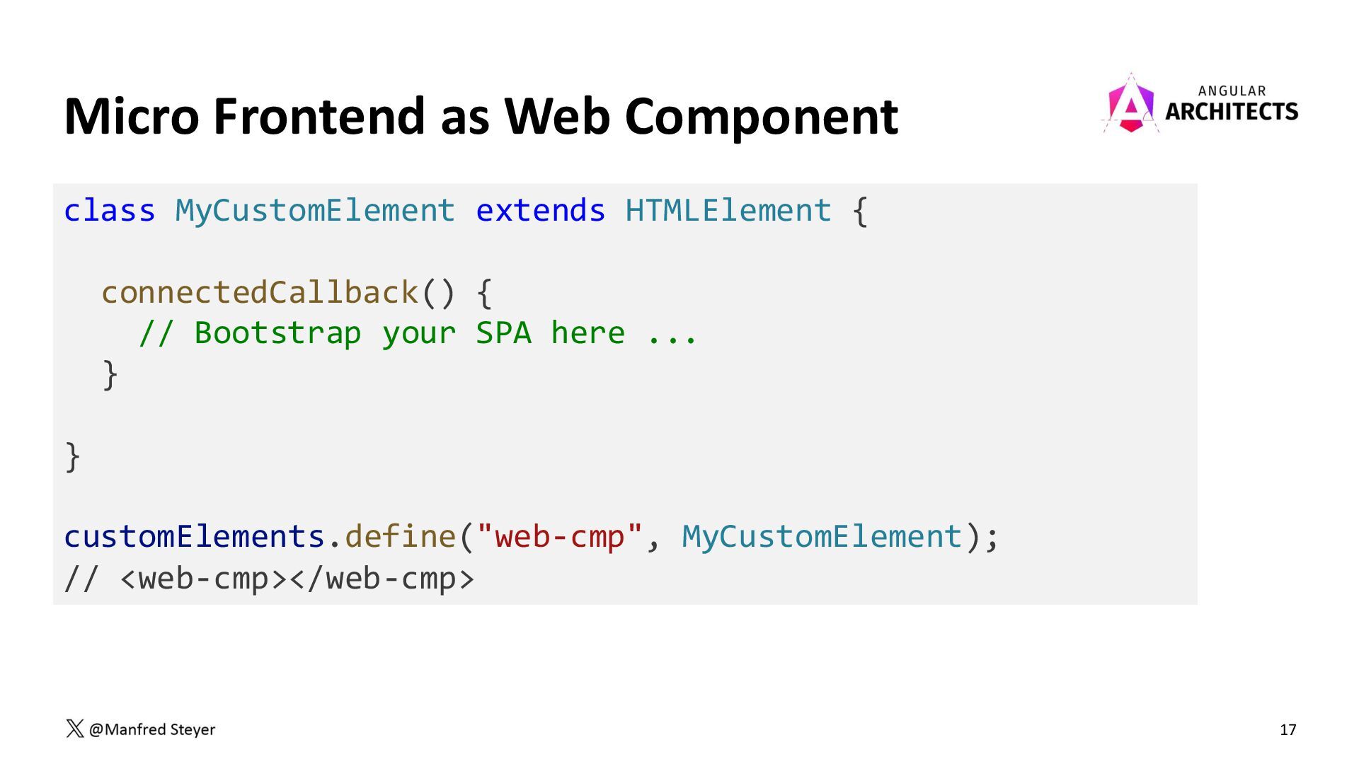 Frontend as Web Component class MyCustomElement extends HTMLElement { connectedCallback() { // Bootstrap your SPA here ... } } customElements.define("web-cmp", MyCustomElement);