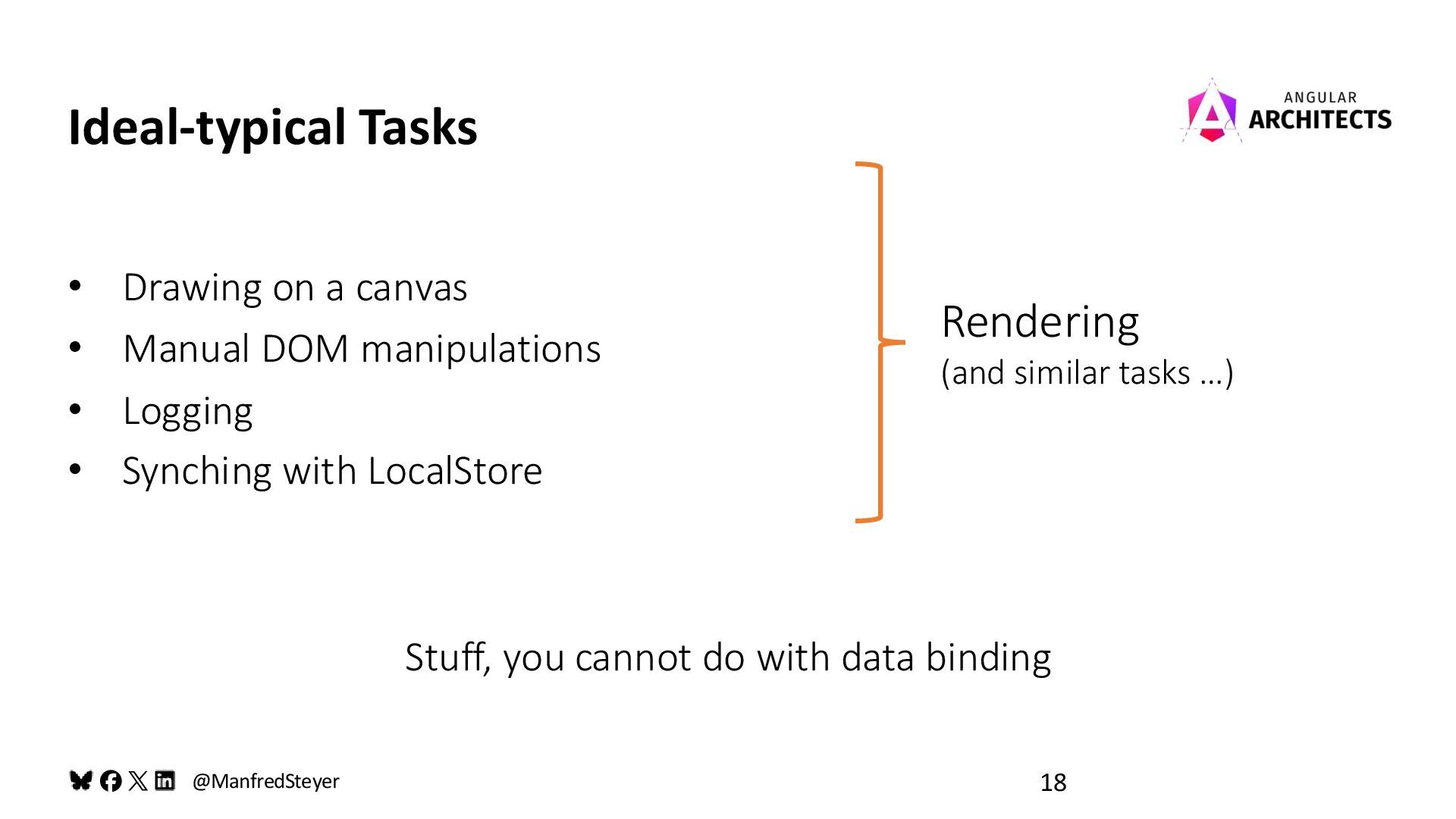 DOM manipulations • Logging • Synching with LocalStore Ideal-typical Tasks Rendering (and similar tasks …) Stuff, you cannot do with data binding