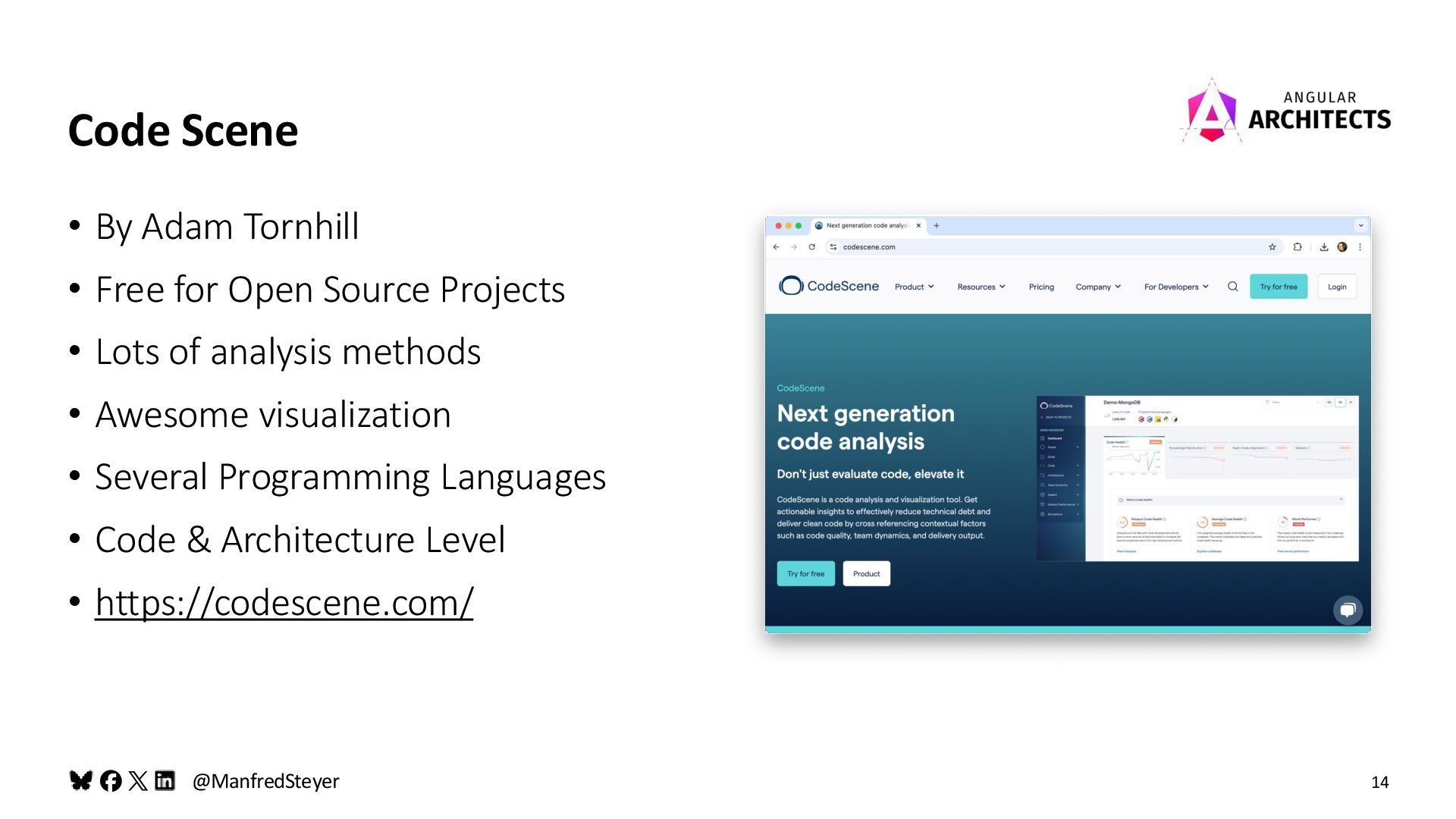 By Adam Tornhill • Free for Open Source Projects • Lots of analysis methods • Awesome visualization • Several Programming Languages • Code & Architecture Level • https://codescene.com/ 14 Code Scene