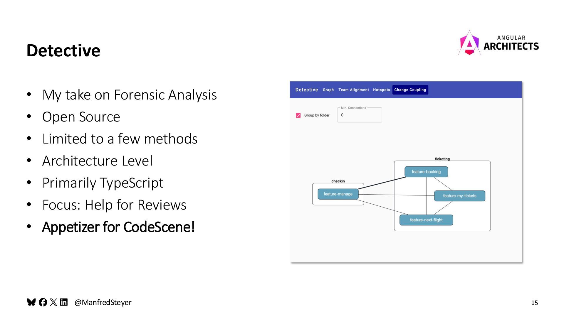 My take on Forensic Analysis • Open Source • Limited to a few methods • Architecture Level • Primarily TypeScript • Focus: Help for Reviews • Appetizer for CodeScene! 15 Detective