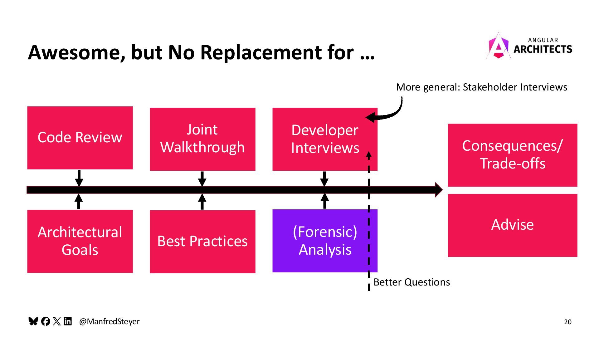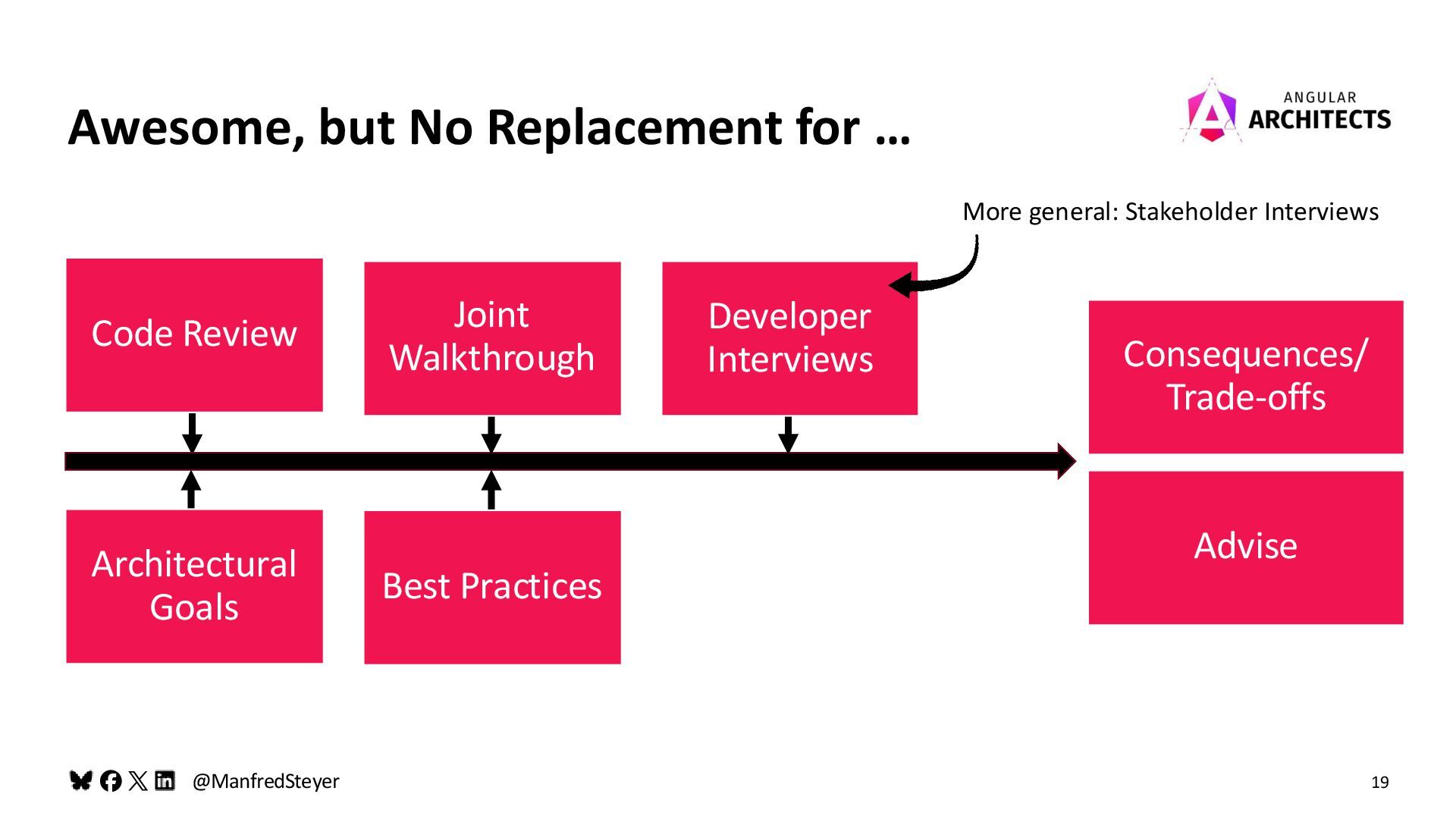 Awesome, but No Replacement for … Code Review Best Practices Architectural Goals Consequences/ Trade-offs Advise Joint Walkthrough Developer Interviews More general: Stakeholder Interviews