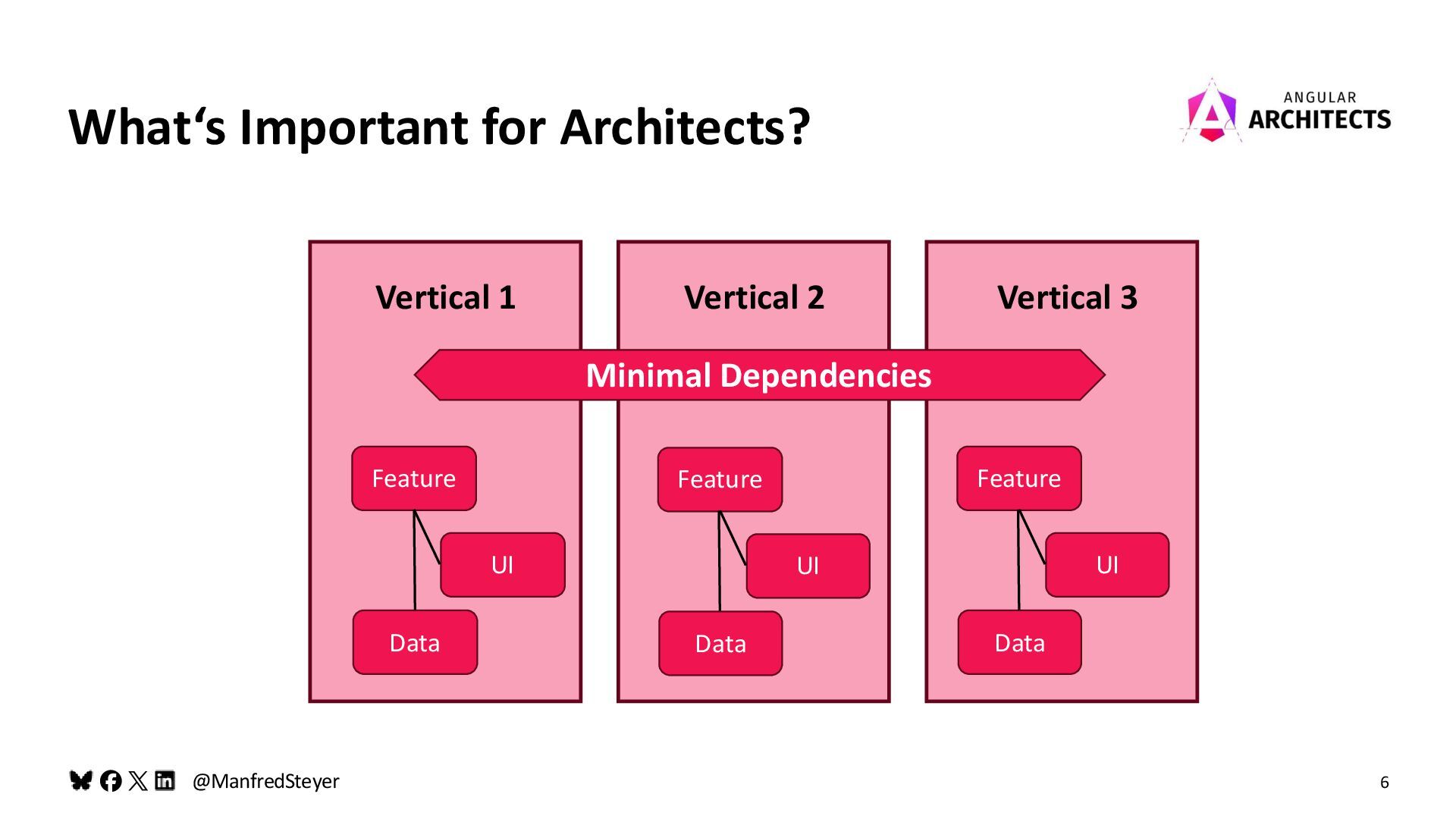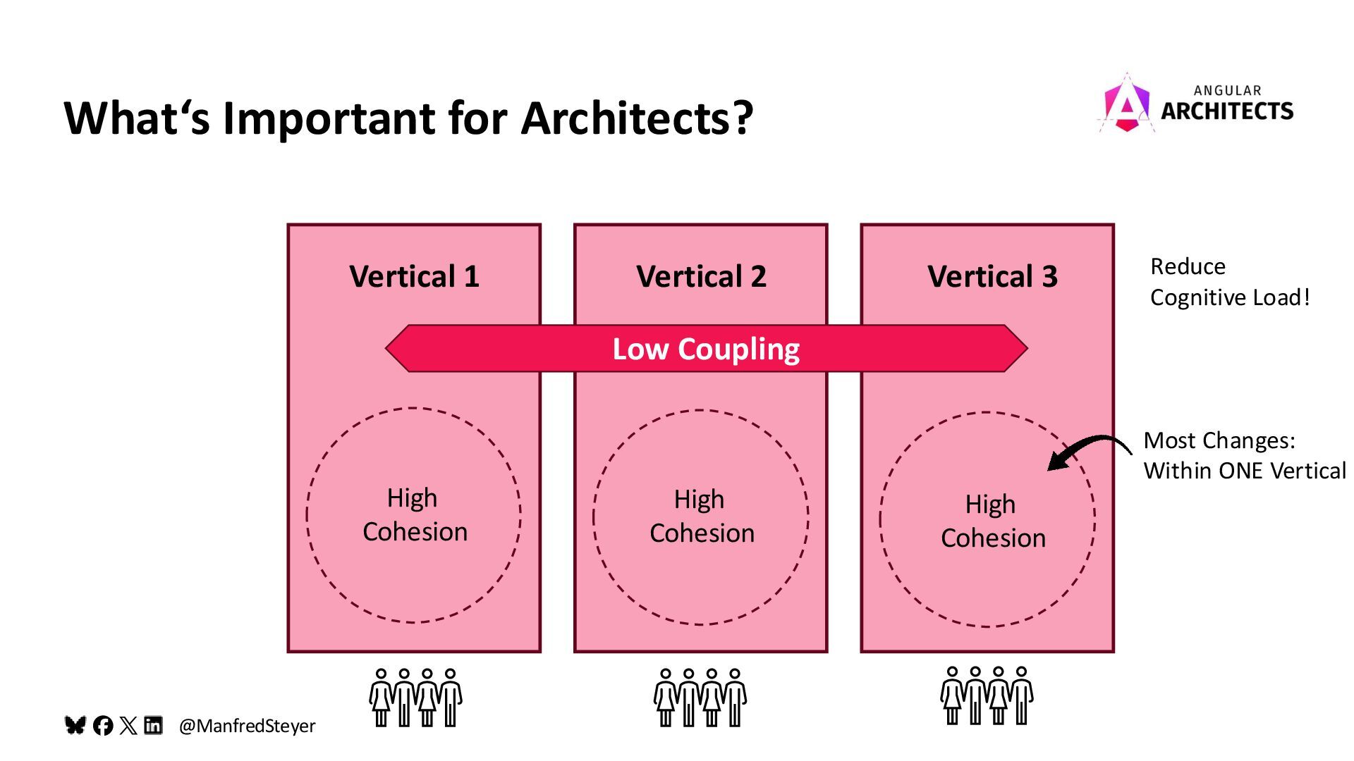 What‘s Important for Architects? Low Coupling Vertical 1 Vertical 2 Vertical 3 High Cohesion High Cohesion High Cohesion Most Changes: Within ONE Vertical Reduce Cognitive Load!