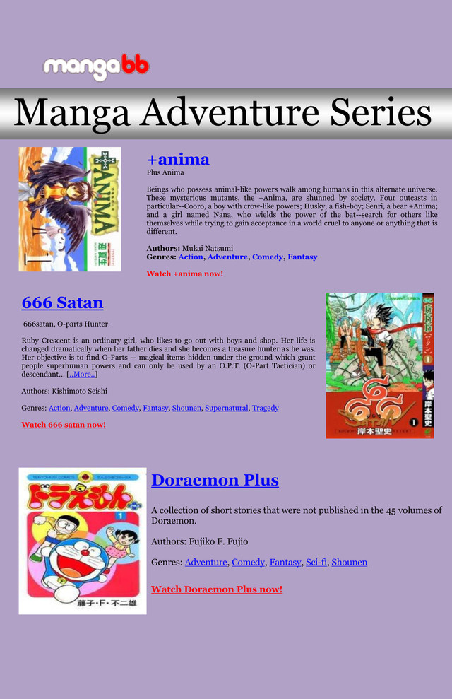 Beings who possess animal-like powers walk among humans in this alternate universe. These mysterious mutants, the +Anima, are shunned by society. Four outcasts in particular--Cooro, a boy with crow-like powers; Husky, a fish-boy; Senri, a bear +Anima; and a girl named Nana, who wields the power of the bat--search for others like themselves while trying to gain acceptance in a world cruel to anyone or anything that is different.