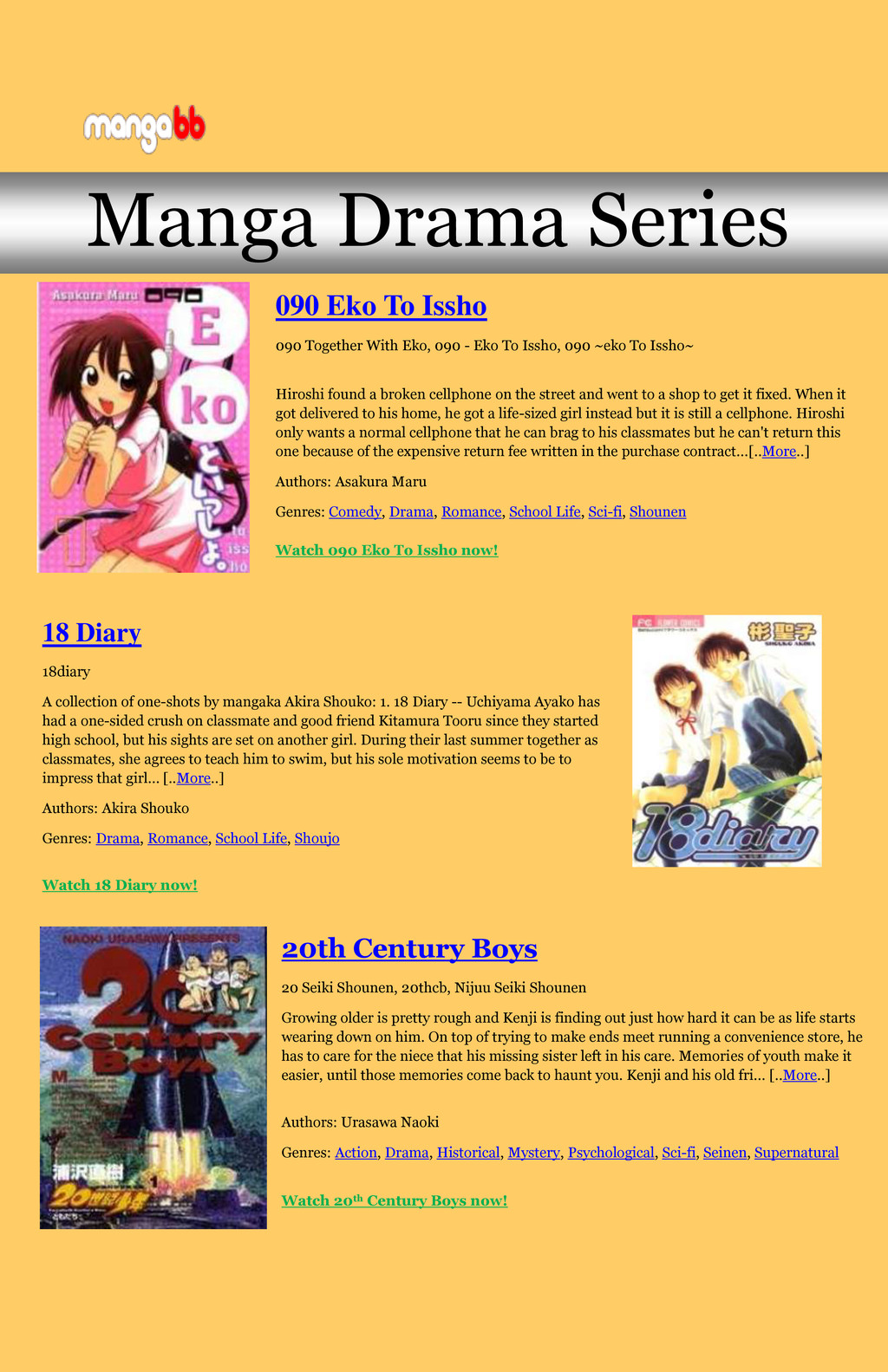 Eko, 090 - Eko To Issho, 090 ~eko To Issho~ Hiroshi found a broken cellphone on the street and went to a shop to get it fixed. When it got delivered to his home, he got a life-sized girl instead but it is still a cellphone. Hiroshi only wants a normal cellphone that he can brag to his classmates but he can't return this one because of the expensive return fee written in the purchase contract…[..More..] Authors: Asakura Maru Genres: Comedy, Drama, Romance, School Life, Sci-fi, Shounen Watch 090 Eko To Issho now! 18 Diary 18diary A collection of one-shots by mangaka Akira Shouko: 1. 18 Diary -- Uchiyama Ayako has had a one-sided crush on classmate and good friend Kitamura Tooru since they started high school, but his sights are set on another girl. During their last summer together as classmates, she agrees to teach him to swim, but his sole motivation seems to be to impress that girl… [..More..] Authors: Akira Shouko Genres: Drama, Romance, School Life, Shoujo Watch 18 Diary now! 20th Century Boys 20 Seiki Shounen, 20thcb, Nijuu Seiki Shounen Growing older is pretty rough and Kenji is finding out just how hard it can be as life starts wearing down on him. On top of trying to make ends meet running a convenience store, he has to care for the niece that his missing sister left in his care. Memories of youth make it easier, until those memories come back to haunt you. Kenji and his old fri… [..More..] Authors: Urasawa Naoki Genres: Action, Drama, Historical, Mystery, Psychological, Sci-fi, Seinen, Supernatural Watch 20th Century Boys now!
