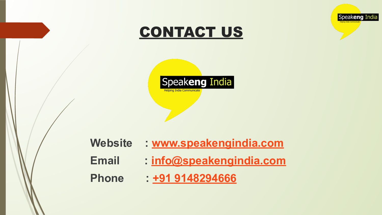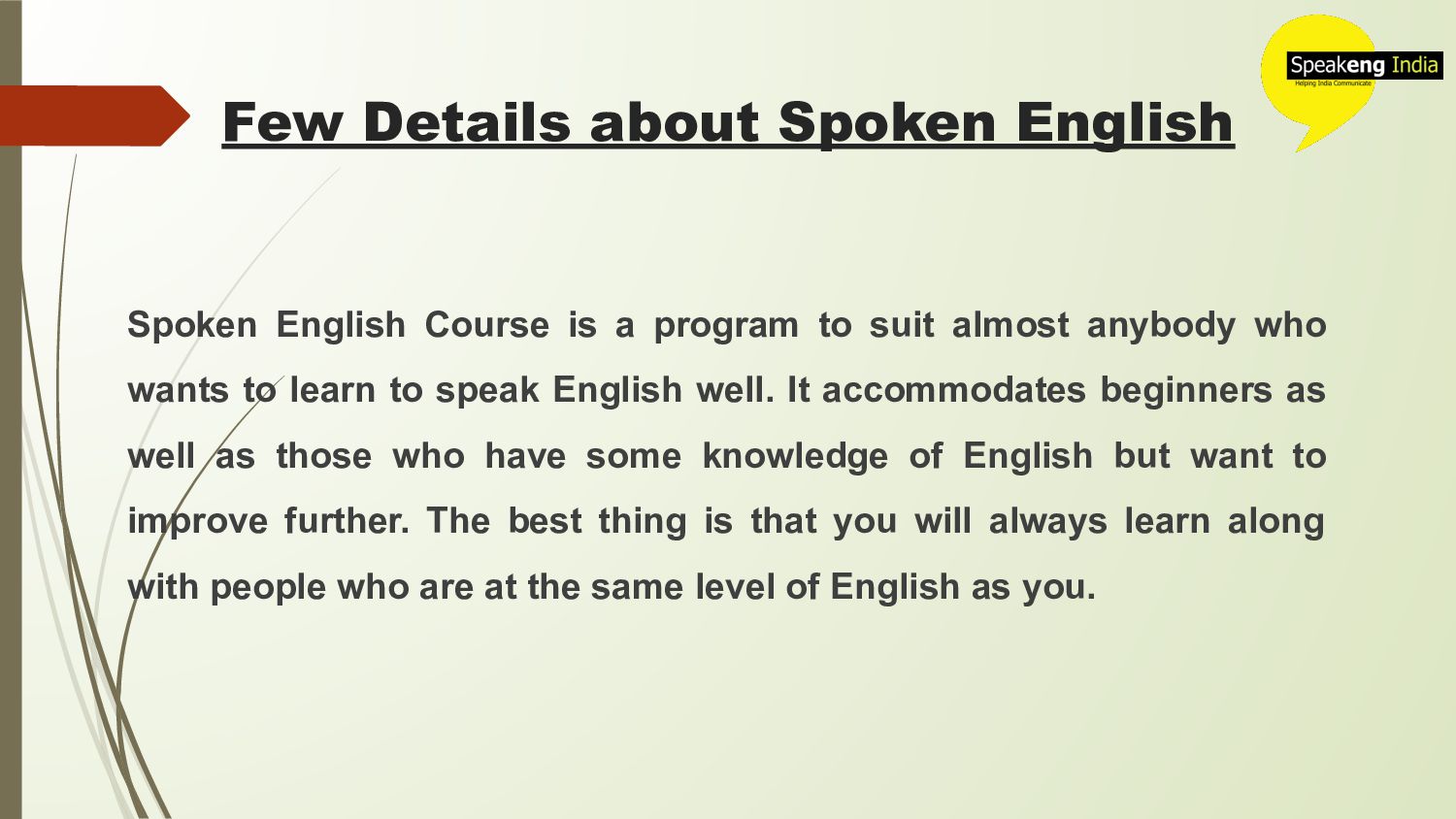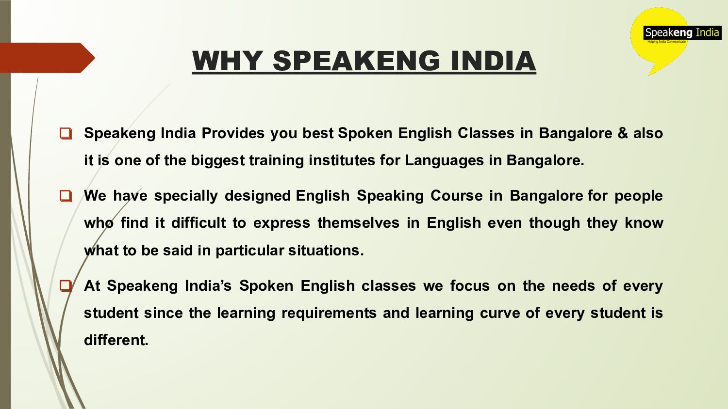 Top English Speaking Classes in Bangalore @ Speakeng India. Spoken English classes in Bangalore @ Affordable Fees. Learn English Speaking Course in Bangalore from 100% Certified Trainers. Visit https://www.speakengindia.com/spoken-english-classes-in-bangalore/ for more details.