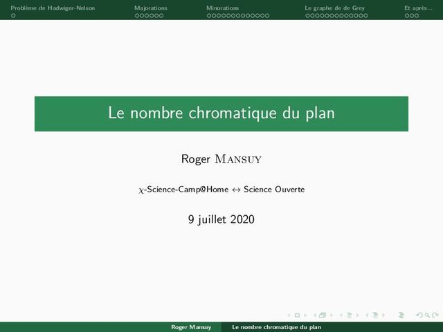 . . . . . . . . . . . . . . . . . . . . . . . . . . . . . . Problème de Hadwiger-Nelson Majorations Minorations Le graphe de de Grey Et après... Le nombre chromatique du plan Roger Mansuy χ-Science-Camp@Home ↔ Science Ouverte 9 juillet 2020 Roger Mansuy Le nombre chromatique du plan