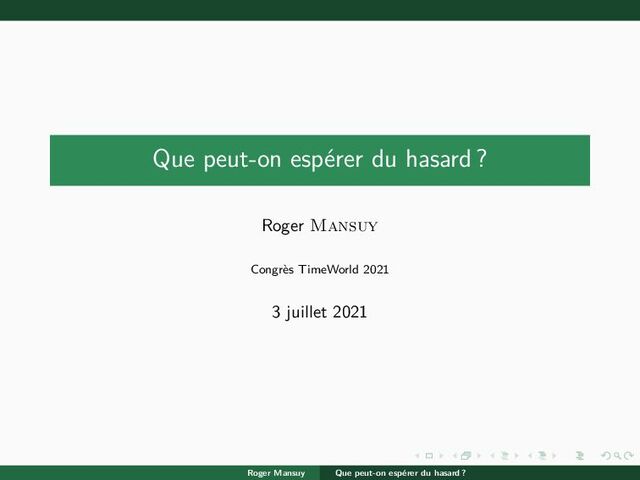 . . . . . . . . . . . . . . . . . . . . . . . . . . . . . . Exemple Si le score est 2-1 en faveur du joueur A au moment de l’interruption, il y a plusieurs évolutions possibles : A emporte la partie suivante (et donc le match sur le score 3-1) B emporte la partie suivante puis A emporte la partie suivante (et donc le match sur le score 3-2) B emporte la partie suivante (et donc le match sur le score 2-3) Roger Mansuy Que peut-on espérer du hasard ?