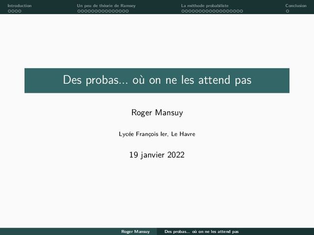 Conclusion Des probas... où on ne les attend pas Roger Mansuy Lycée François Ier, Le Havre 19 janvier 2022 Roger Mansuy Des probas... où on ne les attend pas