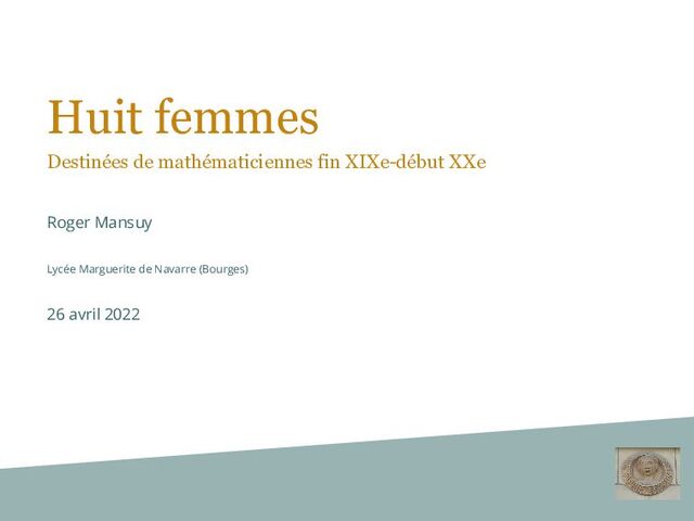 Exposé autour de 8 biographies de mathématiciennes (fin XIXe-début XXe) donné pour les élèves de seconde du lycée Marguerite de Navarre à Bourges le 26 avril 2022