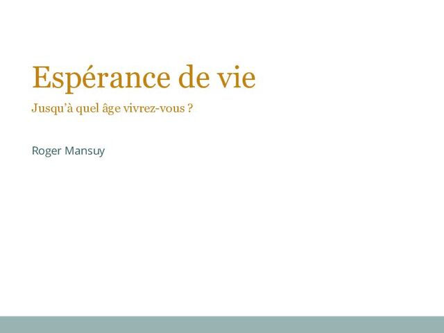 les pk correspondant à cette population puis déduire l’espérance de vie pour ce groupe. Les exemples fréquents dans la presse sont • les hommes ou les femmes • une classe d’âge • une classe sociale • les titulaires d’un certain niveau de diplômes On peut aussi chercher non le décès mais la perte d’autonomie ou une dégradation significative de santé; on obtient avec le même algorithme une espérance de vie ”en bonne santé”.