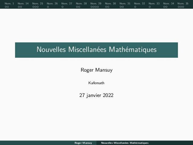 Num. 28 Num. 29 Num. 30 Num. 31 Num. 32 Num. 33 Num. 34 Num. 35 Les miscellanées sont un genre littéraire composé de textes divers, « mélangés » avec une unité plus ou moins manifeste. C’est une technique de fragments, une sorte de mosaïque littéraire. Wikipedia Lors du premier confinement de 2020, une émission en direct sur la chaîne Myriogon a proposé 25 sujets mathématiques pour attiser la curiosité ou frapper l’imagination. Le début de ce support provient de cette tentative d’interactions confinées. Roger Mansuy Nouvelles Miscellanées Mathématiques