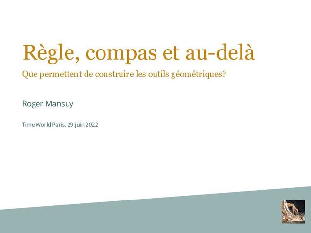 π) n’est pas algébrique (Ferdinand von Lindemann, 1882) • le polynôme minimal de 3 √ 2 est de degré 3 • il existe un angle problématique pour la trisection Théorème Aucun des trois problèmes grecs n’est résoluble à la règle et au compas!
