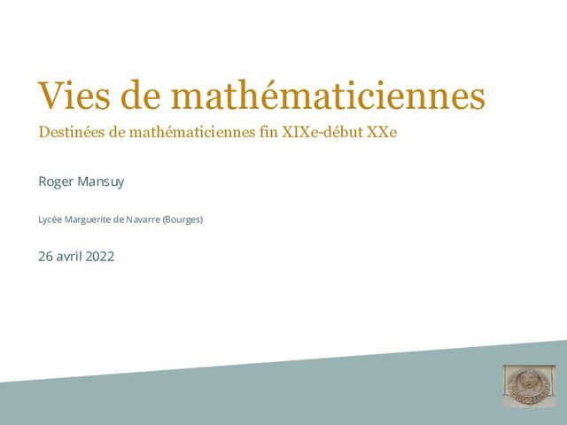 pour les élèves de seconde et qui illustreront les propos de cet exposé: • Charlotte Angas Scott, née en 1858 • Lioubna Bortniker, née en 1860 • Grace Chisholm-Young, née en 1868 • Emmy Noether, née en 1882 • Sophie Piccard, née en 1904 • Marie-Louise Dubreil-Jacotin, née en 1905 • Olga Taussky-Todd, née en 1906 • Olga Ladyzhenskaya, née en 1922