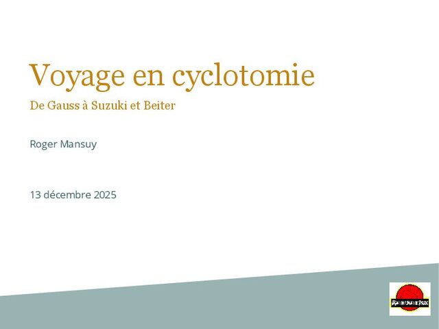 Résumé : Apparus dans les travaux de Gauss sur la constructibilité à la règle et au compas, les polynômes cyclotomiques sont des objets faciles à définir mais qui recèlent encore quelques mystères mathématiques. Avec cette balade historico-mathématique, on se propose d'examiner les coefficients de ces polynômes à travers un siècle de théorèmes (Migotti, Bang, Schur, Beiter et Suzuki)