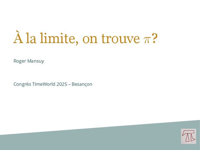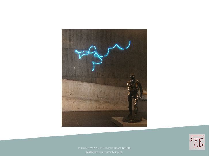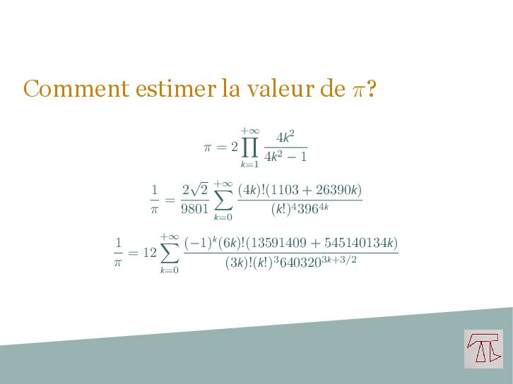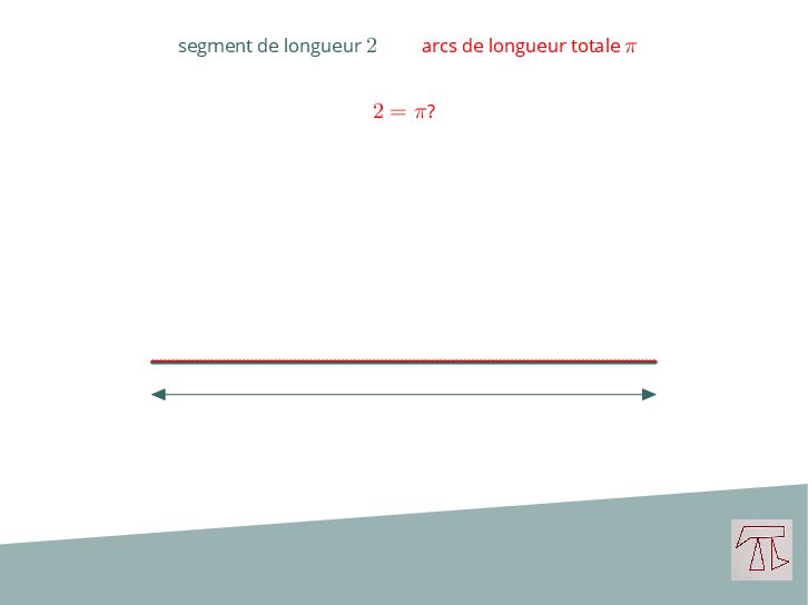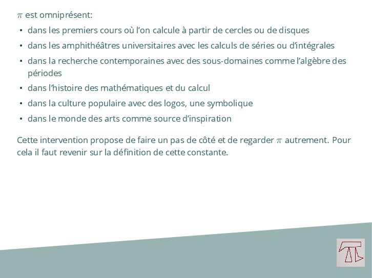 calcule à partir de cercles ou de disques • dans les amphithéâtres universitaires avec les calculs de séries ou d’intégrales • dans la recherche contemporaines avec des sous-domaines comme l’algèbre des périodes • dans l’histoire des mathématiques et du calcul • dans la culture populaire avec des logos, une symbolique • dans le monde des arts comme source d’inspiration Cette intervention propose de faire un pas de côté et de regarder π autrement. Pour cela il faut revenir sur la définition de cette constante.