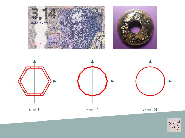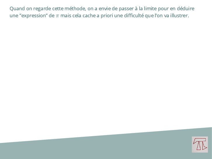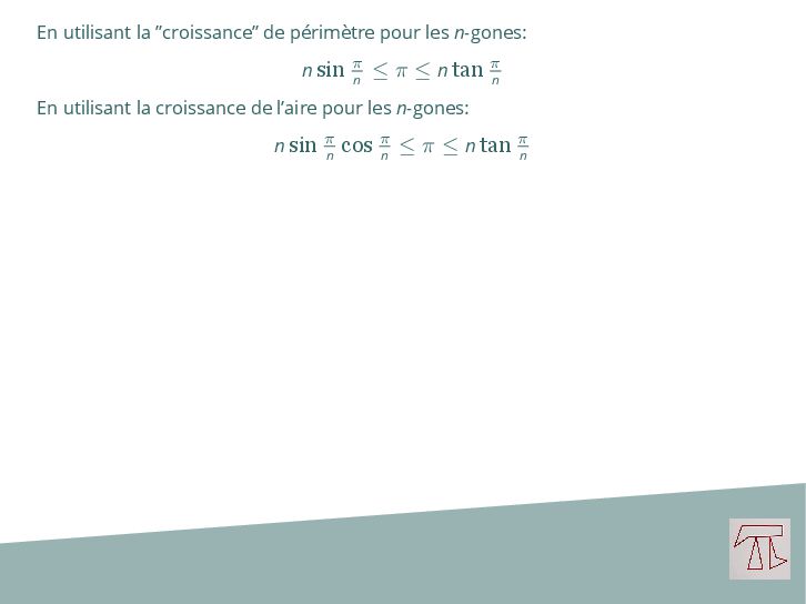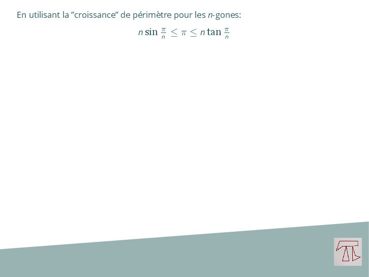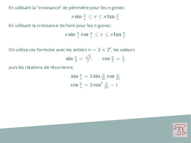 sin π n ≤ π ≤ n tan π n En utilisant la croissance de l’aire pour les n-gones: n sin π n cos π n ≤ π ≤ n tan π n On utilise ces formules avec les entiers n = 3 × 2k, les valeurs sin π 3 = √ 3 2 , cos π 3 = 1 2 puis les relations de récurrence: sin π n = 2 sin π 2n cos π 2n cos π n = 2 cos2 π 2n − 1