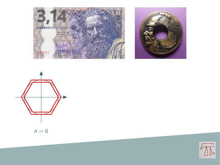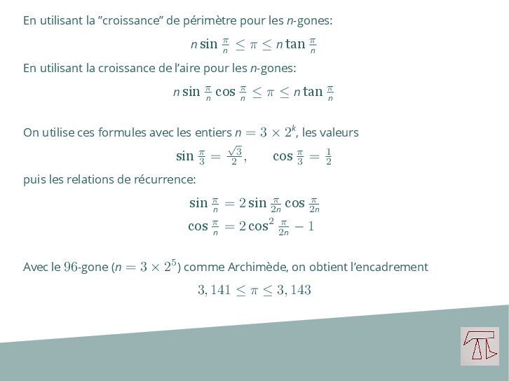 sin π n ≤ π ≤ n tan π n En utilisant la croissance de l’aire pour les n-gones: n sin π n cos π n ≤ π ≤ n tan π n On utilise ces formules avec les entiers n = 3 × 2k, les valeurs sin π 3 = √ 3 2 , cos π 3 = 1 2 puis les relations de récurrence: sin π n = 2 sin π 2n cos π 2n cos π n = 2 cos2 π 2n − 1 Avec le 96-gone (n = 3 × 25) comme Archimède, on obtient l’encadrement 3, 141 ≤ π ≤ 3, 143