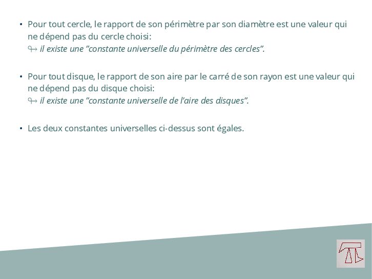 son diamètre est une valeur qui ne dépend pas du cercle choisi: ↬ il existe une ”constante universelle du périmètre des cercles”. • Pour tout disque, le rapport de son aire par le carré de son rayon est une valeur qui ne dépend pas du disque choisi: ↬ il existe une ”constante universelle de l’aire des disques”. • Les deux constantes universelles ci-dessus sont égales.
