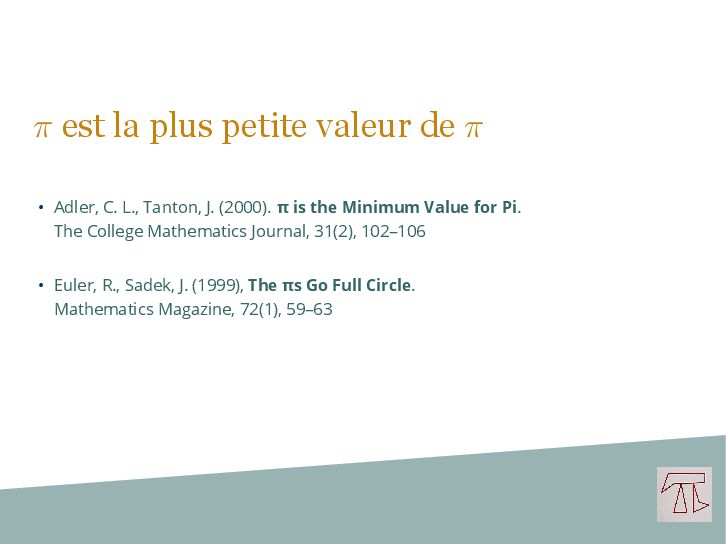 C. L., Tanton, J. (2000). π is the Minimum Value for Pi. The College Mathematics Journal, 31(2), 102–106 • Euler, R., Sadek, J. (1999), The πs Go Full Circle. Mathematics Magazine, 72(1), 59–63