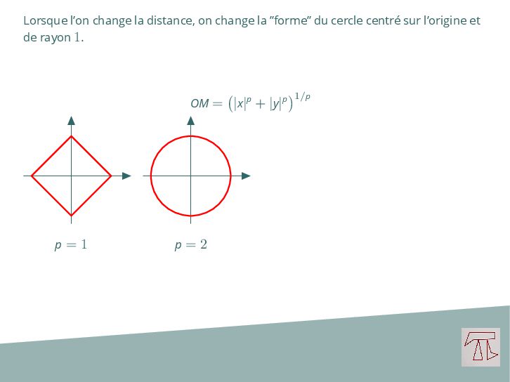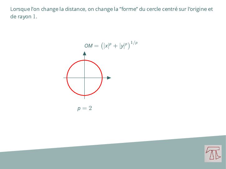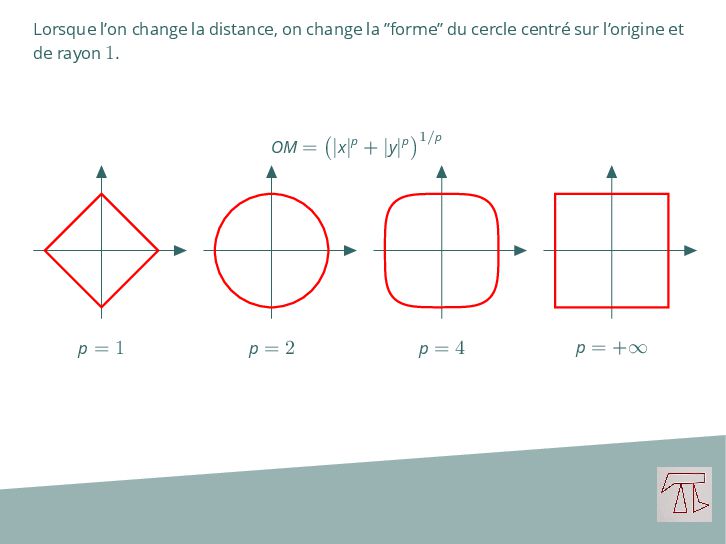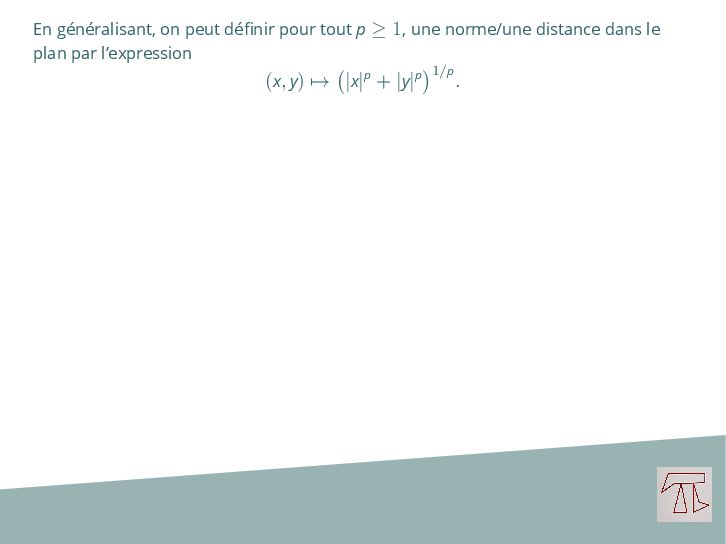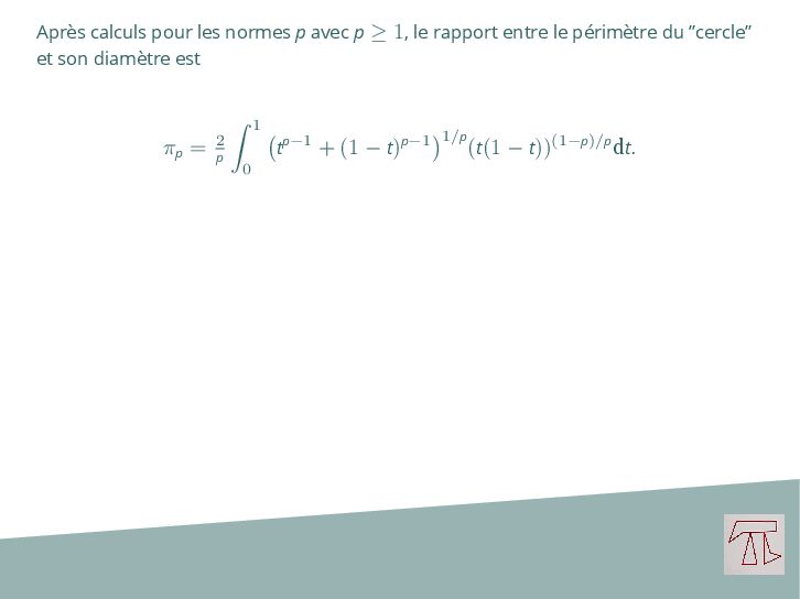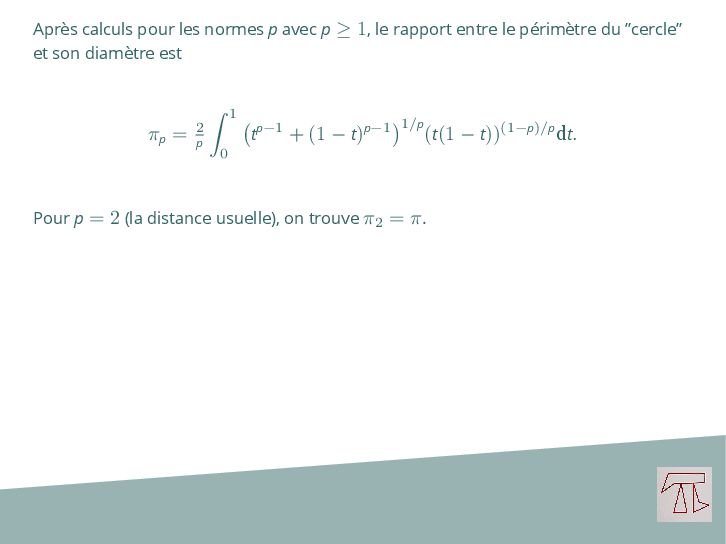 le rapport entre le périmètre du ”cercle” et son diamètre est πp = 2 p ∫ 1 0 ( tp−1 + (1 − t)p−1 )1/p (t(1 − t))(1−p)/pdt. Pour p = 2 (la distance usuelle), on trouve π2 = π.