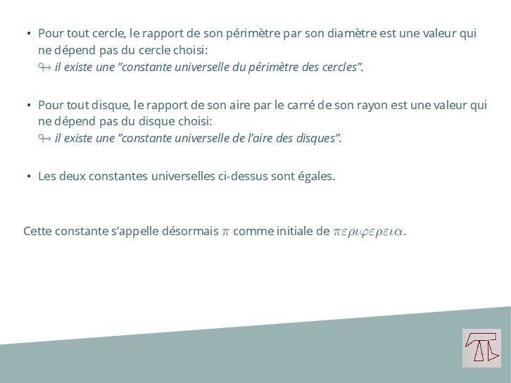 son diamètre est une valeur qui ne dépend pas du cercle choisi: ↬ il existe une ”constante universelle du périmètre des cercles”. • Pour tout disque, le rapport de son aire par le carré de son rayon est une valeur qui ne dépend pas du disque choisi: ↬ il existe une ”constante universelle de l’aire des disques”. • Les deux constantes universelles ci-dessus sont égales. Cette constante s’appelle désormais π comme initiale de περιφερεια.