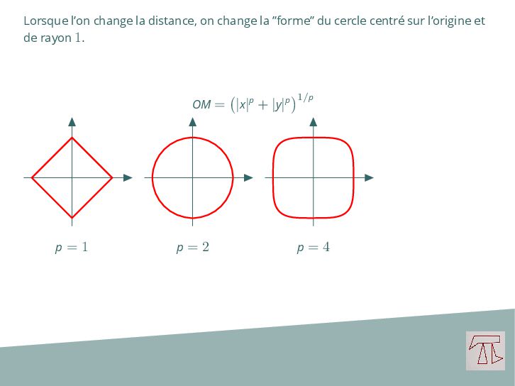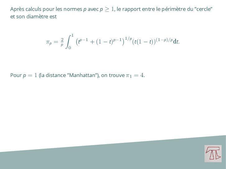 le rapport entre le périmètre du ”cercle” et son diamètre est πp = 2 p ∫ 1 0 ( tp−1 + (1 − t)p−1 )1/p (t(1 − t))(1−p)/pdt. Pour p = 1 (la distance ”Manhattan”), on trouve π1 = 4.