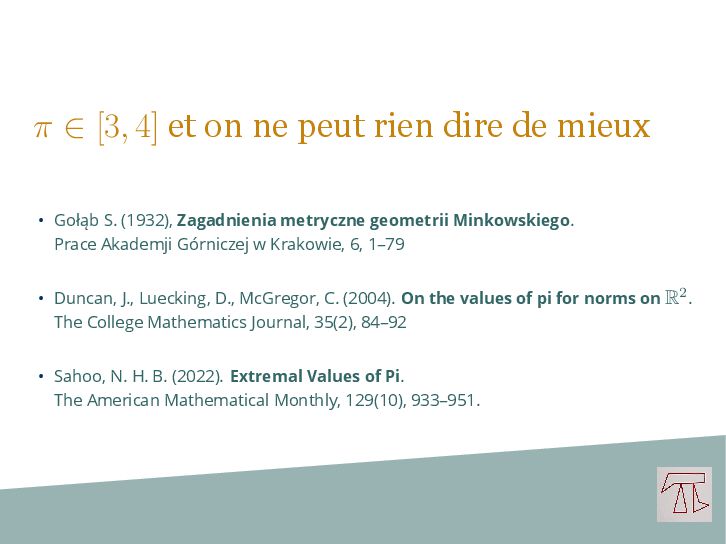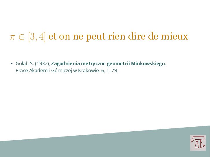 de mieux • Gołąb S. (1932), Zagadnienia metryczne geometrii Minkowskiego. Prace Akademji Górniczej w Krakowie, 6, 1–79 • Duncan, J., Luecking, D., McGregor, C. (2004). On the values of pi for norms on R2. The College Mathematics Journal, 35(2), 84–92 • Sahoo, N. H. B. (2022). Extremal Values of Pi. The American Mathematical Monthly, 129(10), 933–951.